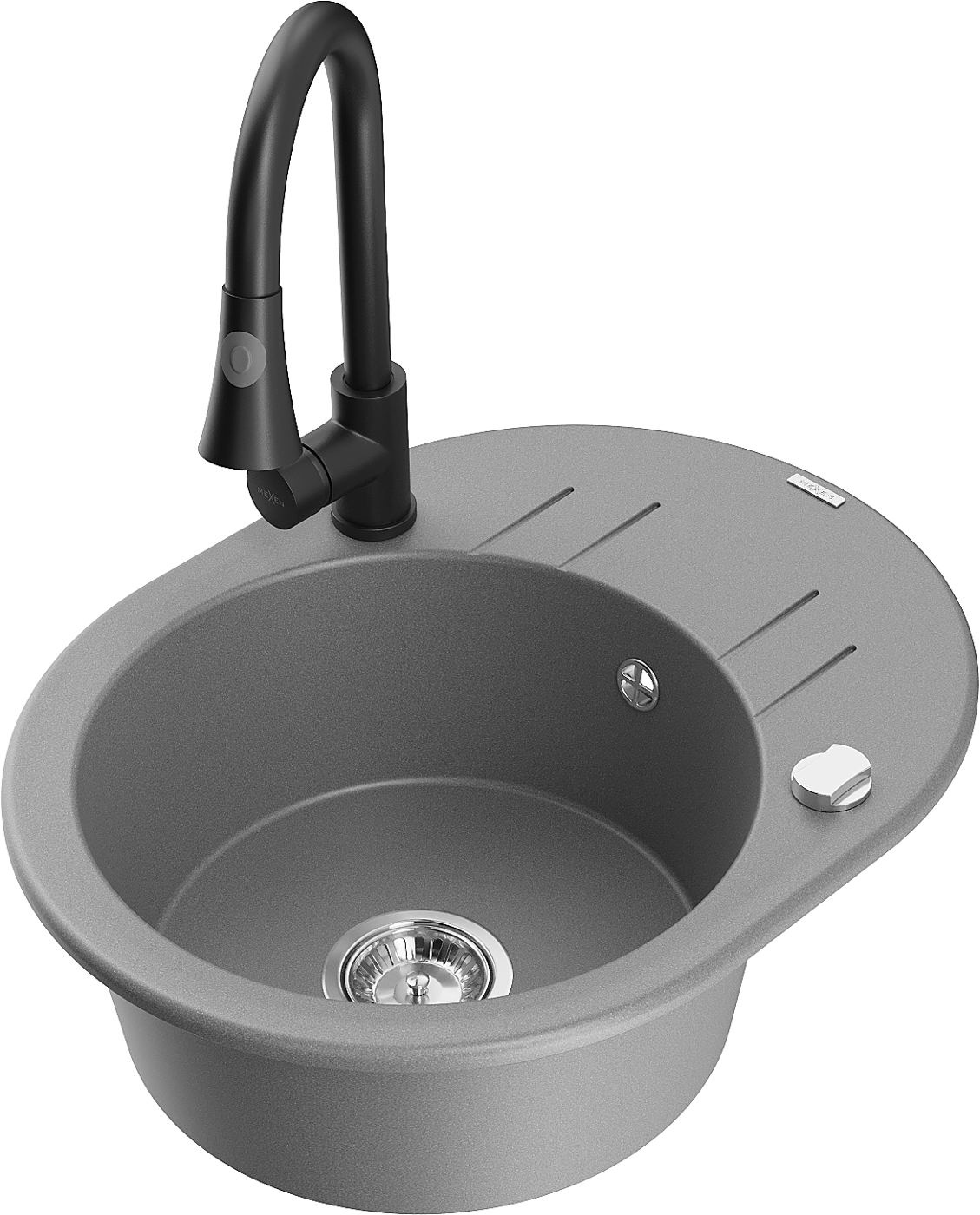 Mexen Kevin žulový drez 1-komorový s odkvapkávacím a kuchynskou batériou Elia, sivý - 6517-71-670101-70