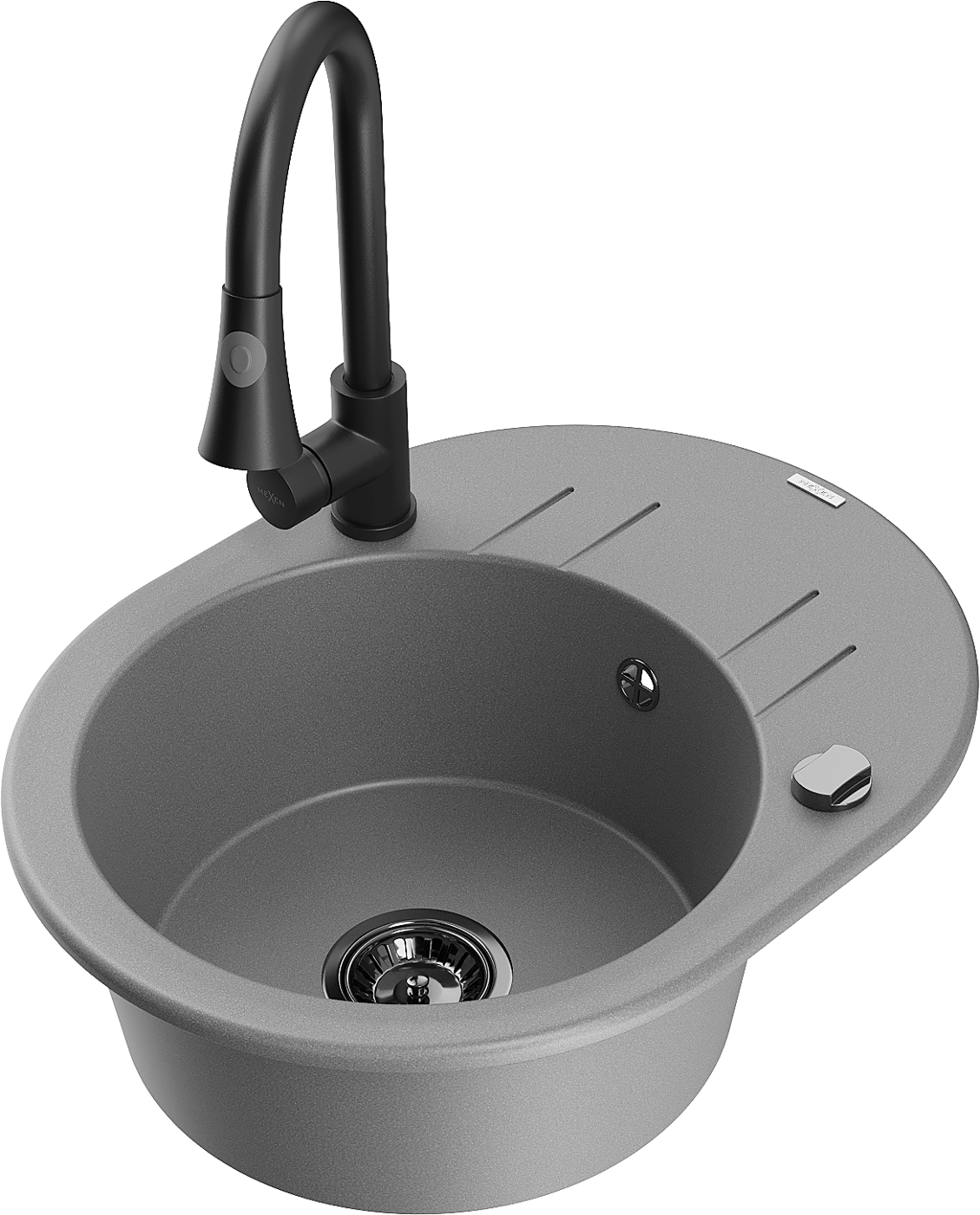 Mexen Kevin žulový kuchynský drez 1-komorový s odkvapkávačom a kuchynská batéria Elia, sivý - 6517-71-670101-70-B