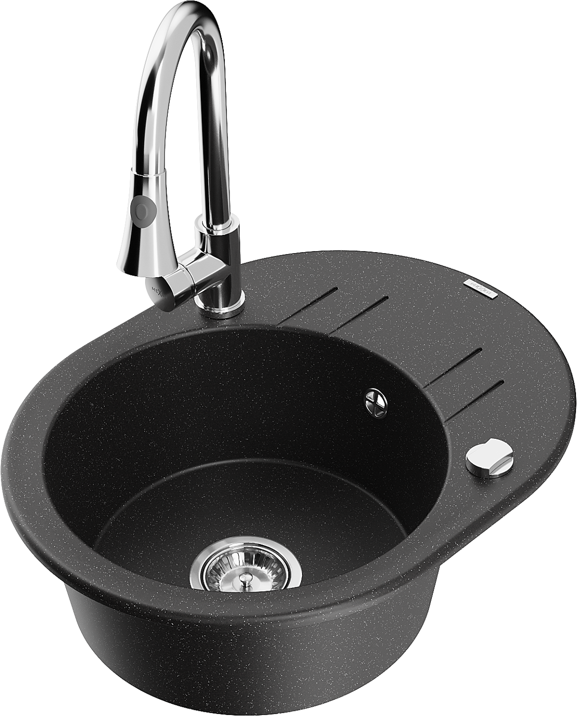 Mexen Kevin granitový kuchynský drez 1-komorový s odkvapkávačom a kuchynskou batériou Elia, čierny/strieborný metalik - 6517-73?