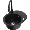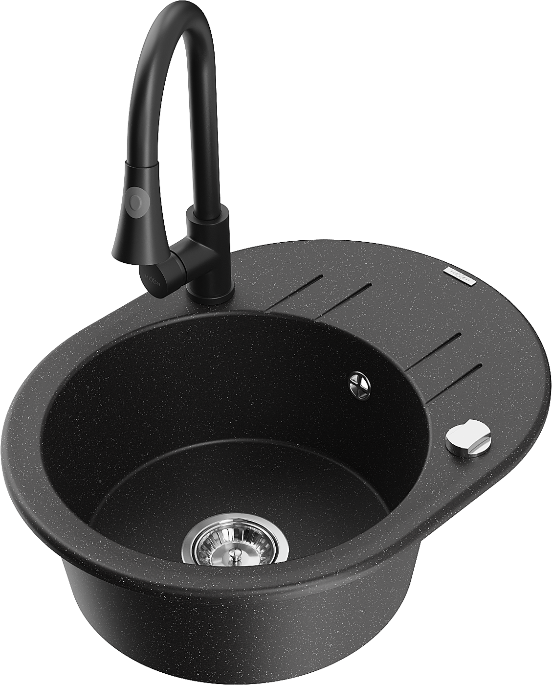 Mexen Kevin granitový jednodrezový kuchynský drez s odkvapom a kuchynskou batériou Elia, čierny/strieborný metalický