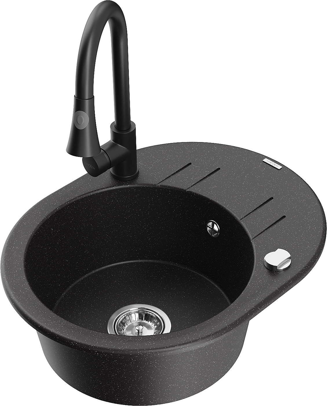 Mexen Kevin granitový jednokomorový drez s odkvapkávačom a kuchynskou batériou Elia, čierny/strieborný metalik - 6517-73-670101?