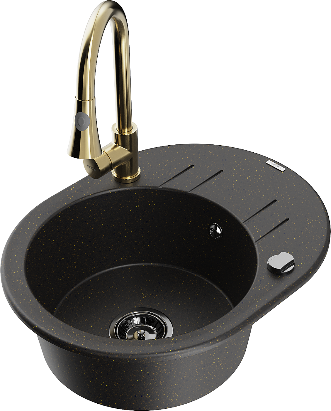 Mexen Kevin žulový kuchynský drez s 1 komorou s odkvapkávačom a kuchynskou batériou Elia, čierny/zlatý metalík - 6517-75-670101?