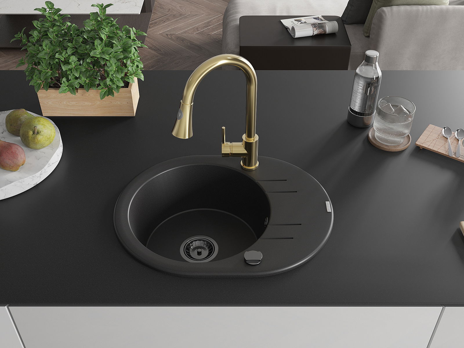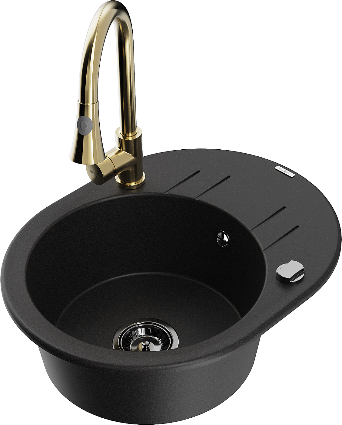 Mexen Kevin granitový drez 1-komorový s odkvapkávačom a kuchynskou batériou Elia, čierny - 6517-77-670101-50-B