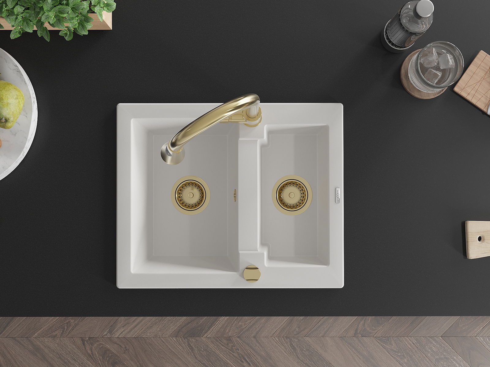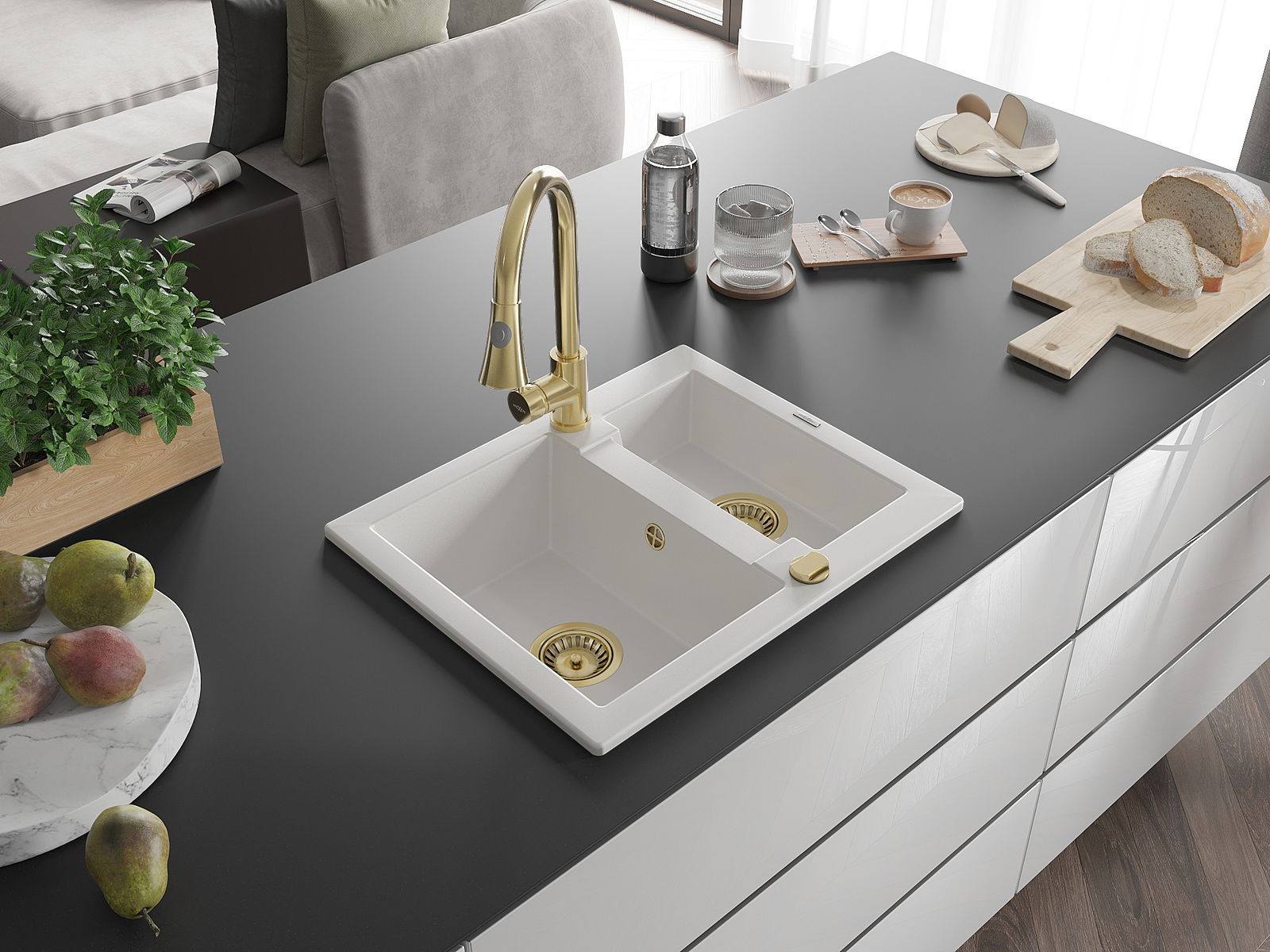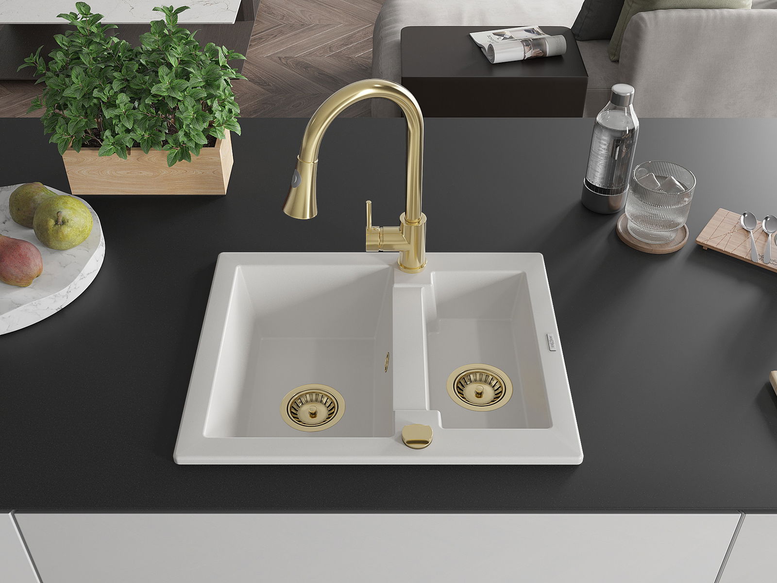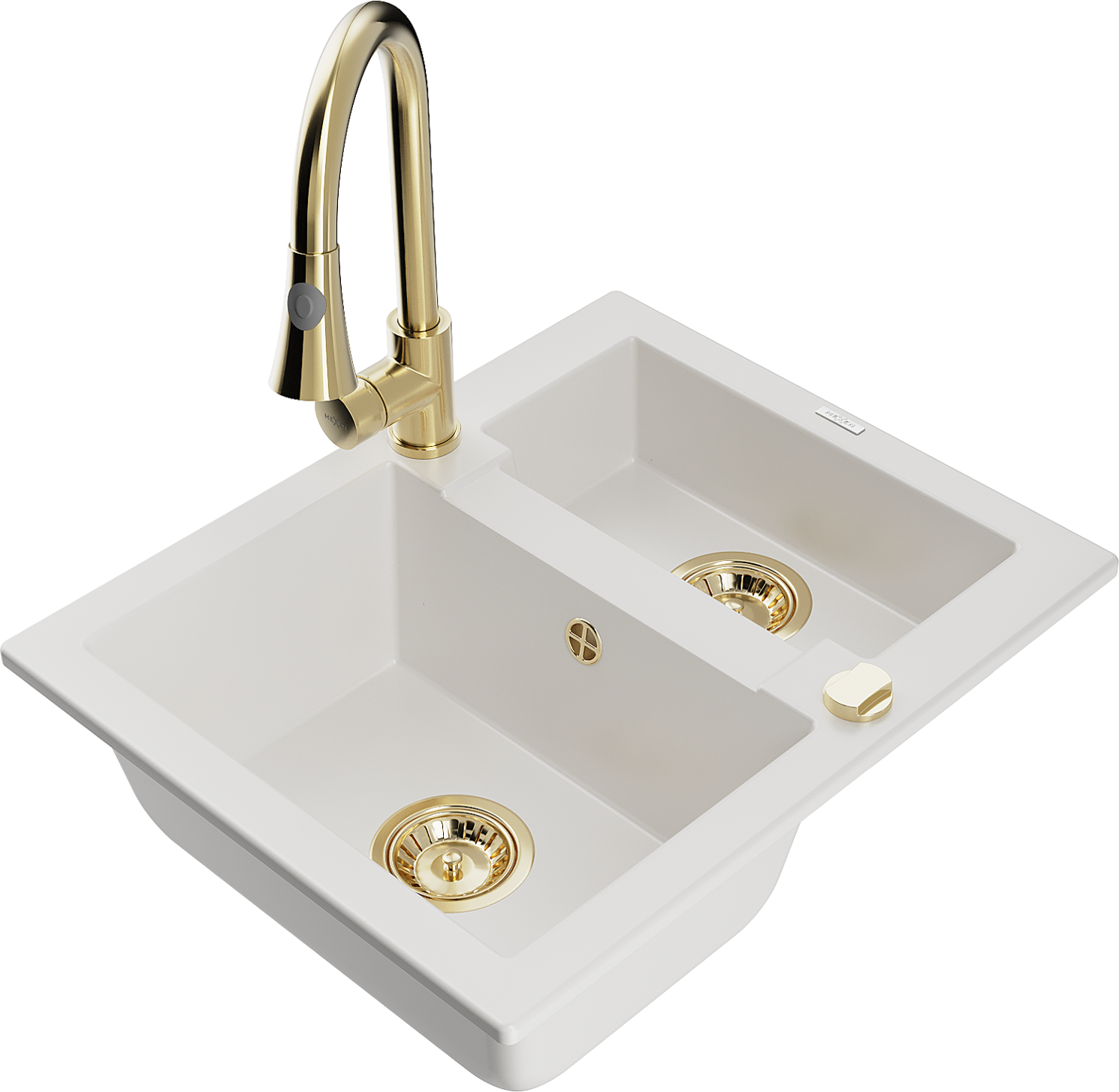 Mexen Carlos žulový drez 1,5-komorový s kuchynskou batériou Elia, biely - 6518-20-670101-50
