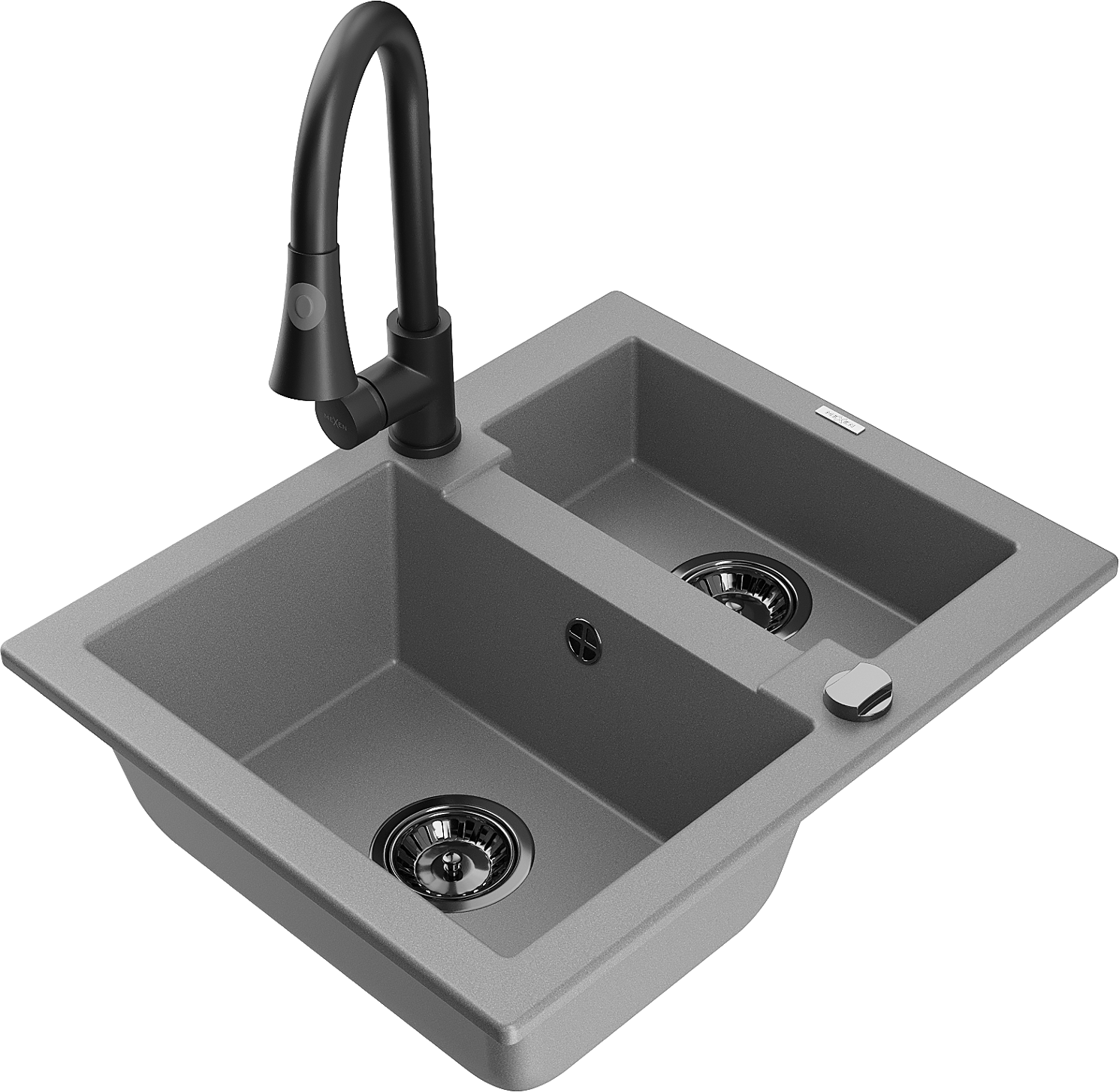 Mexen Carlos granitový kuchynský drez 1,5-komorový s kuchynskou batériou Elia, šedý - 6518-71-670101-70-B