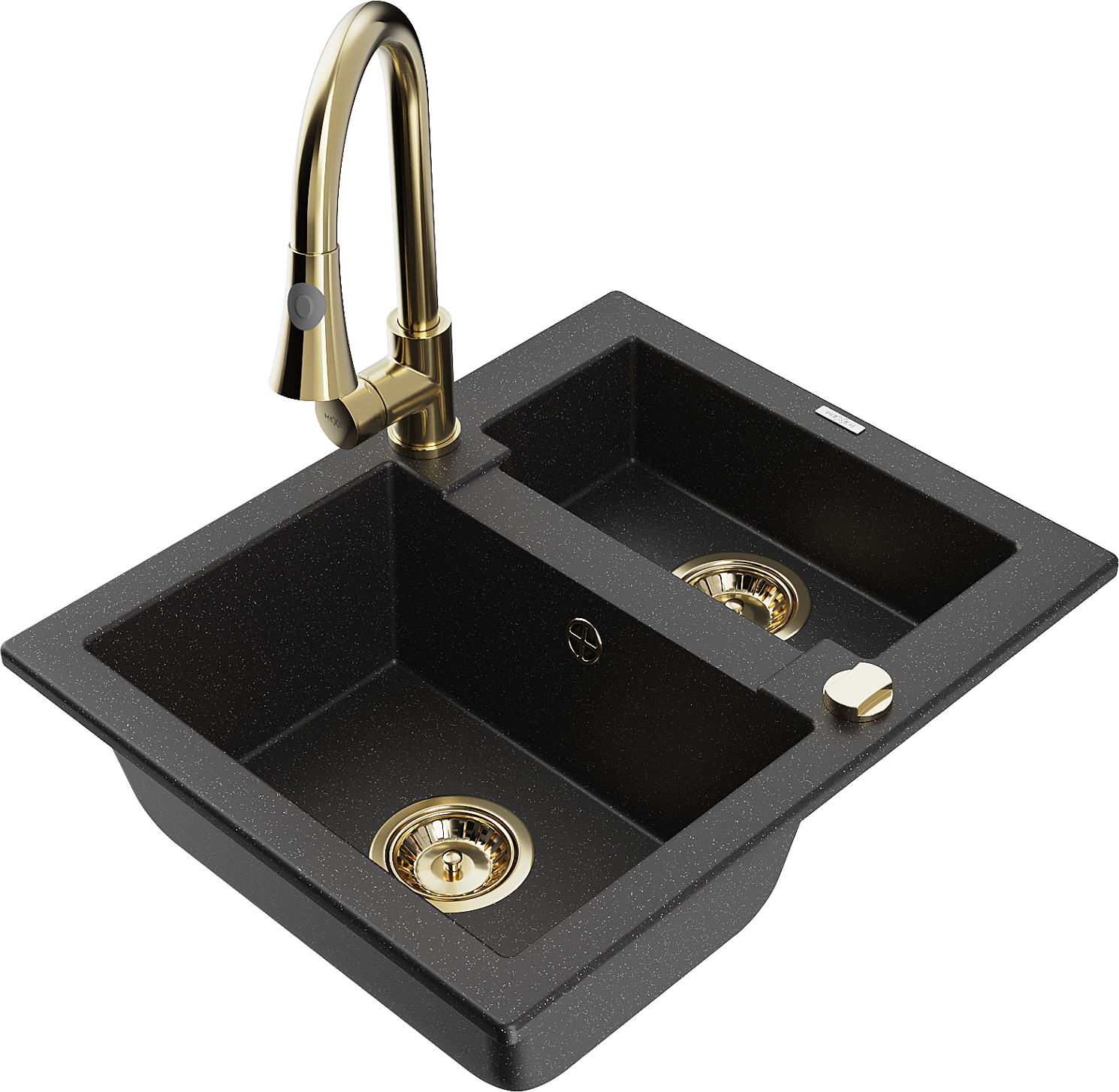Mexen Carlos granitový drez 1,5-komorový s kuchynskou batériou Elia, čierny/strieborný metalik - 6518-73-670101-50