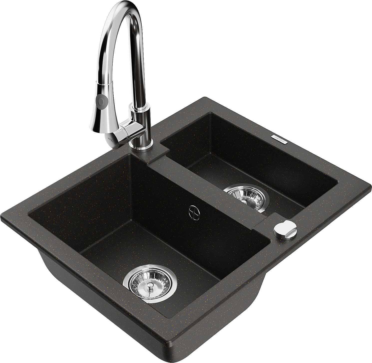 Mexen Carlos žulový drez 1,5-komorový s kuchynskou batériou Elia, čierny/zlatý metalik - 6518-75-670101-00