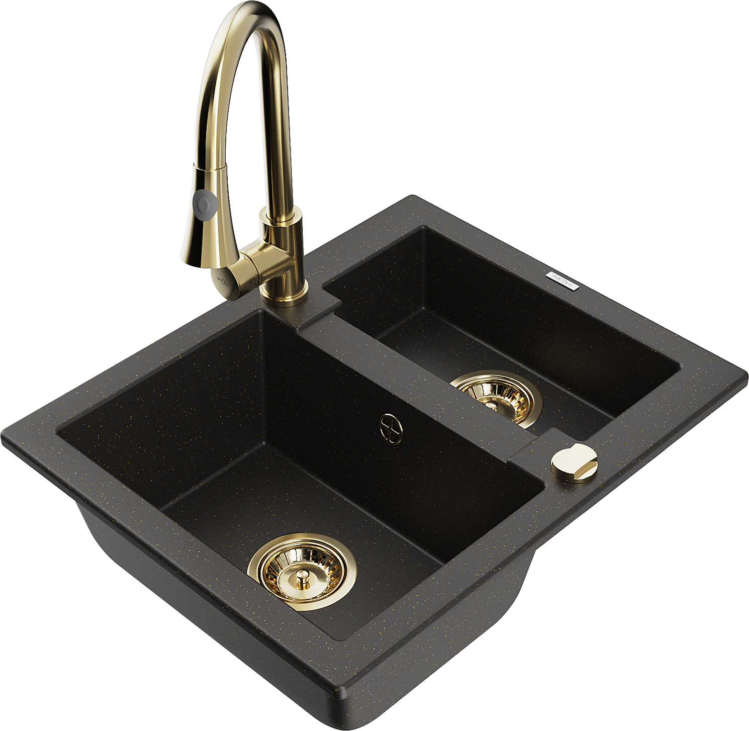Mexen Carlos žulový kuchynský drez s 1,5 komorou a kuchynskou batériou Elia, čierny/zlatý metalický - 6518-75-670101-50