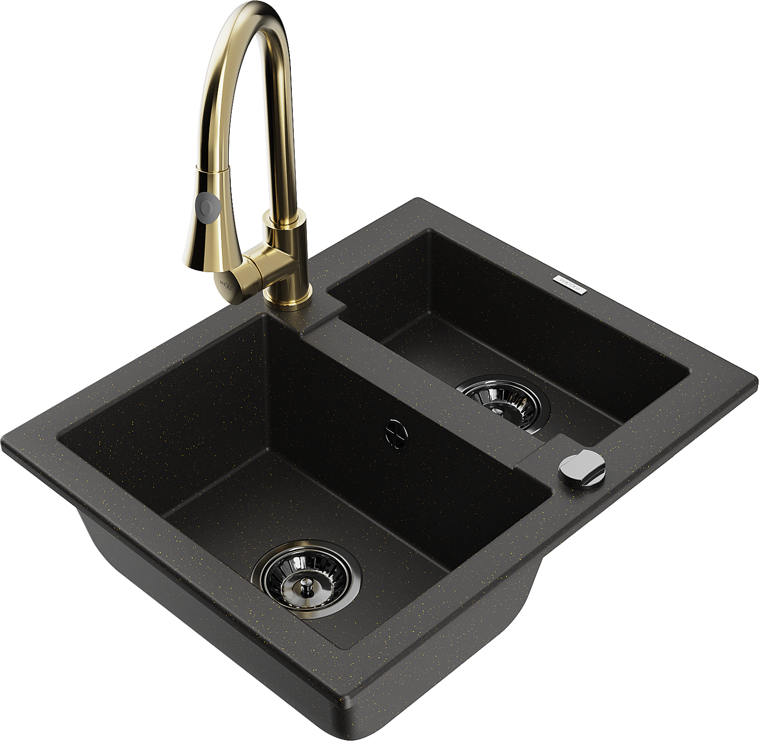Mexen Carlos 1,5-komorový granitový drez s kuchynskou batériou Elia, čierny/zlatý metalík - 6518-75-670101-50-B