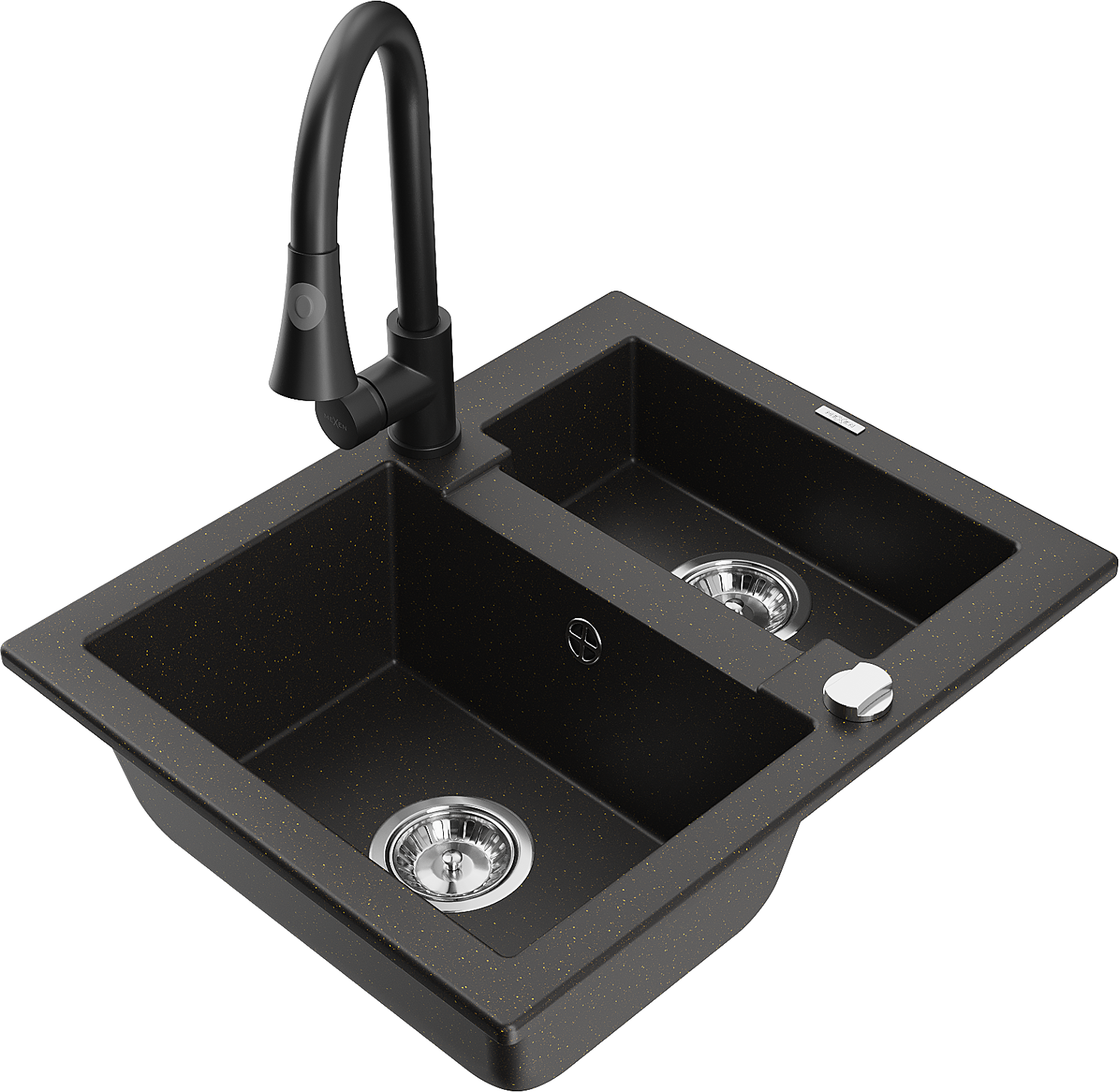 Mexen Carlos žulový drez 1,5-komorový s kuchynskou batériou Elia, čierny/zlatý metalický - 6518-75-670101-70