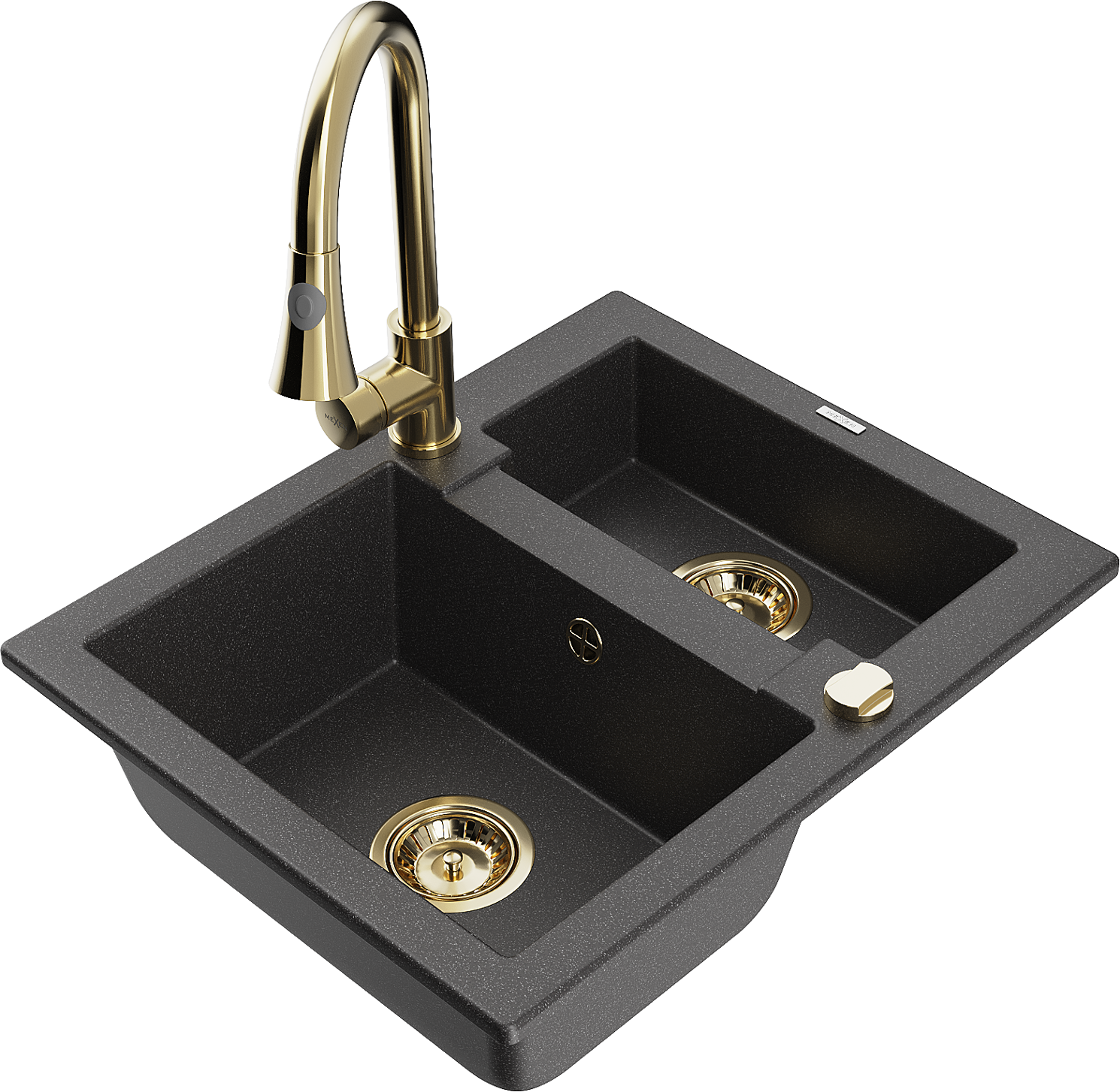 Mexen Carlos granitový drez s 1,5 komorou s kuchynskou batériou Elia, čierny škvrnitý - 6518-76-670101-50