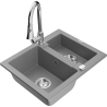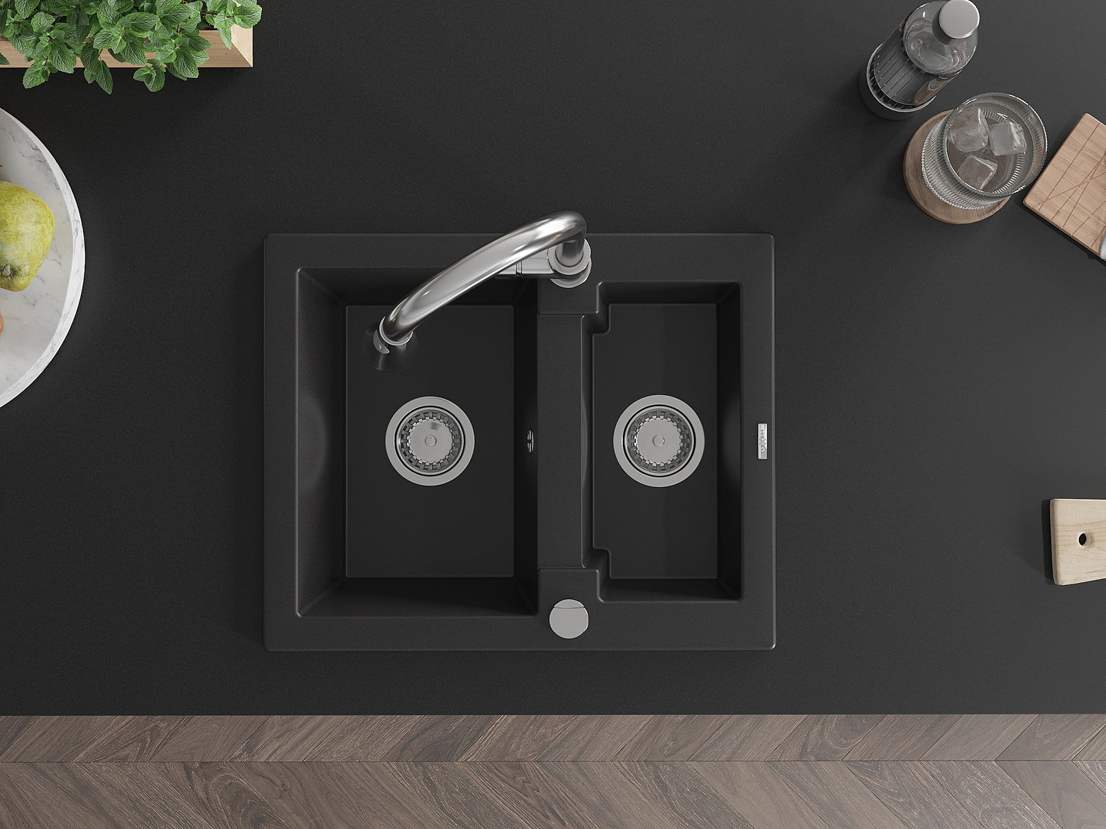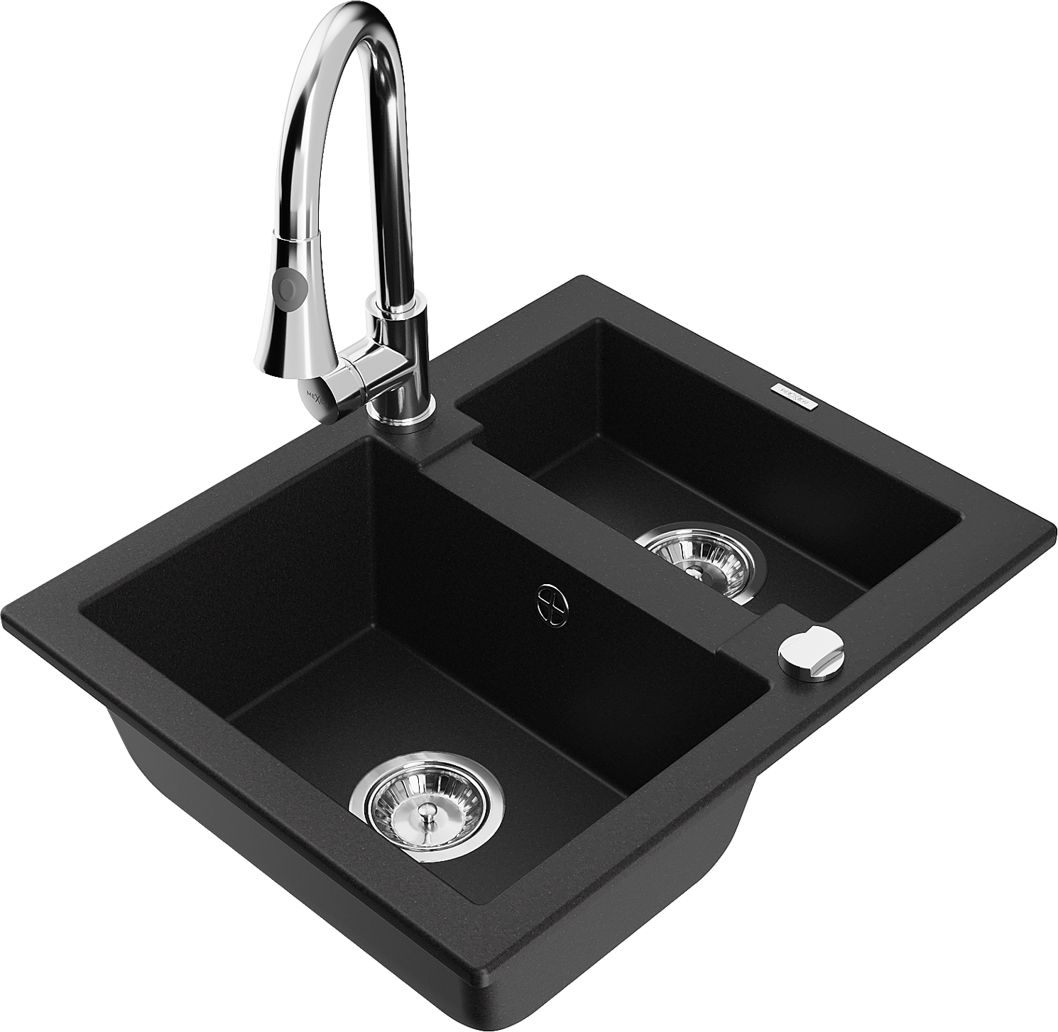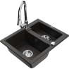 Mexen Carlos žulový kuchynský drez 1,5-komorový s kuchynskou batériou Elia, čierny - 6518-77-670101-00