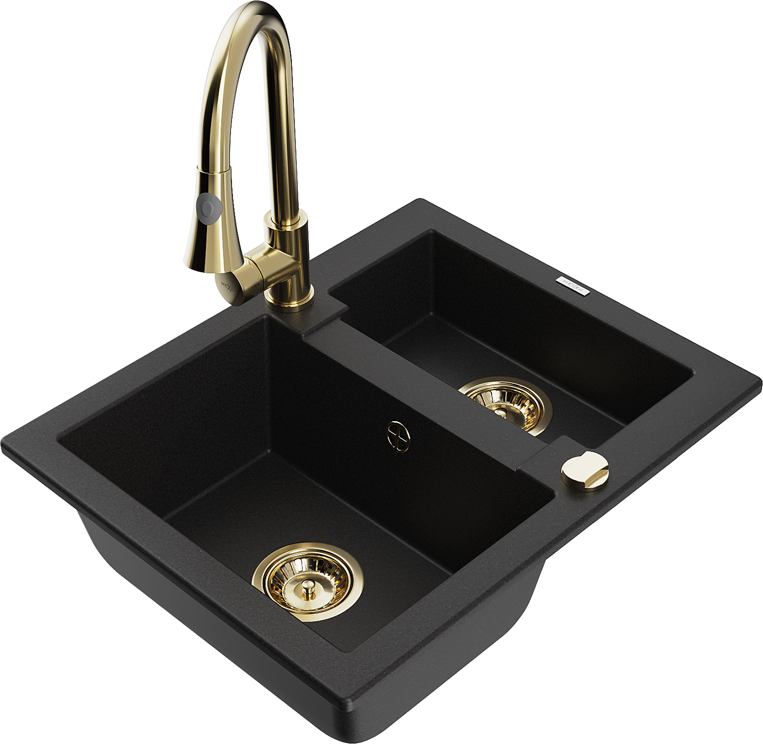 Mexen Carlos granitový drez 1,5-komorový s kuchynskou batériou Elia, čierny - 6518-77-670101-50