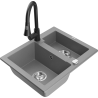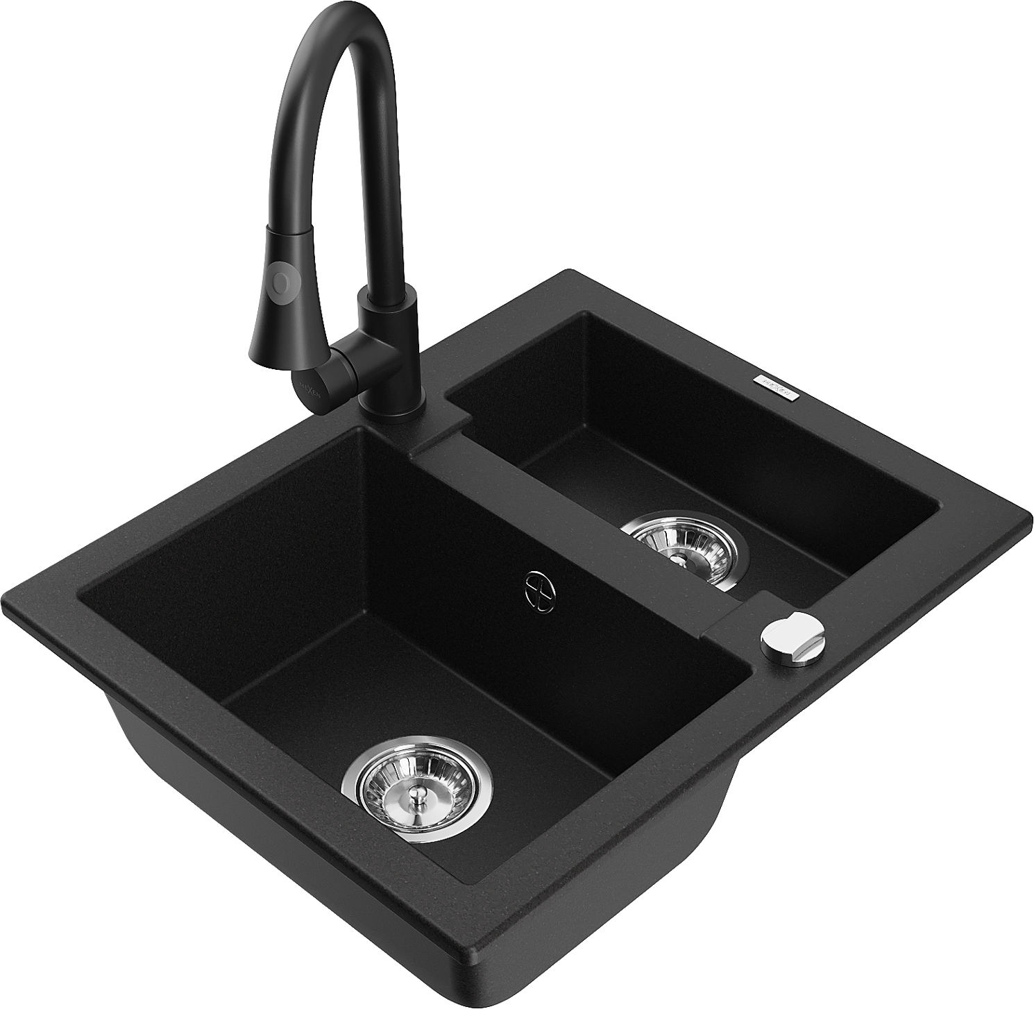 Mexen Carlos granitový drezu, 1,5-komorový s kuchynskou batériou Elia, čierny - 6518-77-670101-70