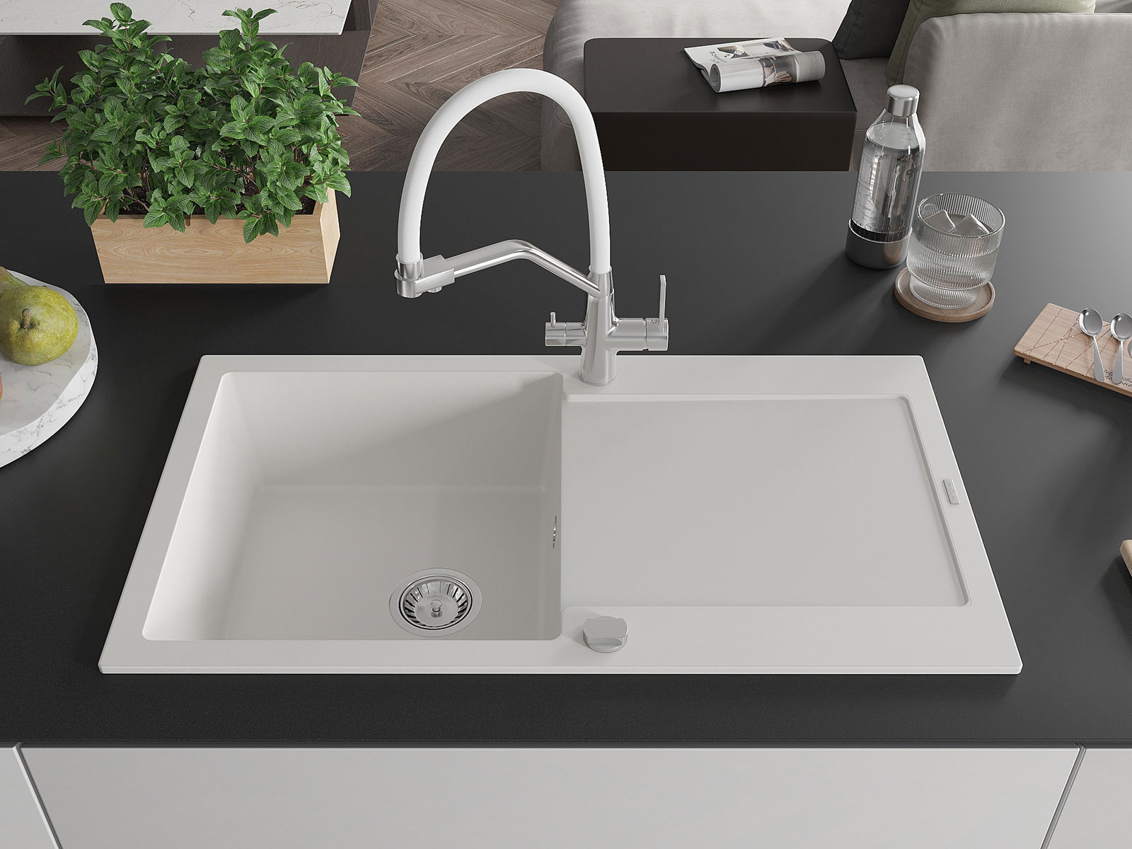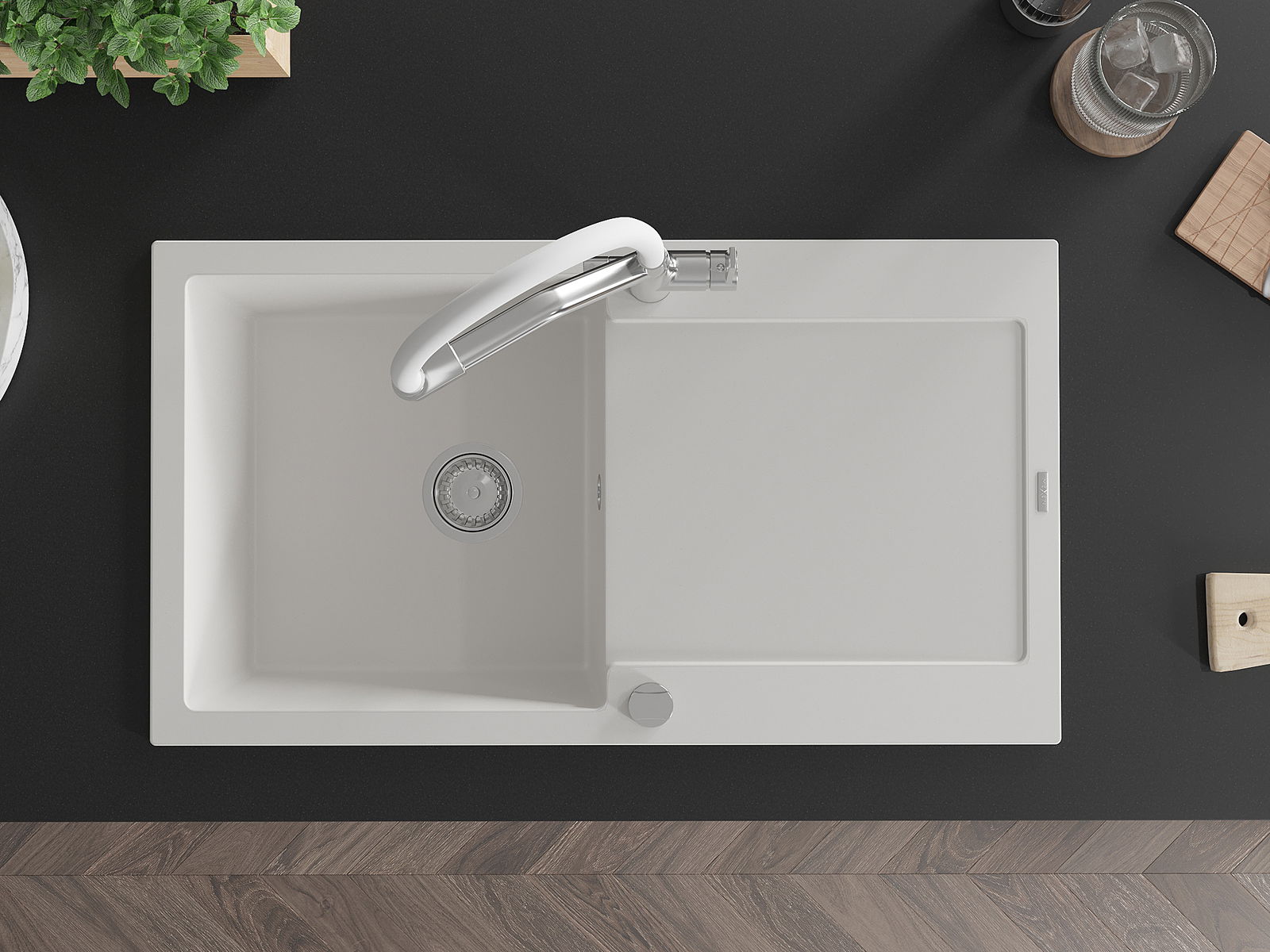 Povrch kuchynského drezu je odolný voči škvrnám a zafarbeniu, vďaka čomu sa ľahko udržiava a zachováva svoju farbu počas dlhého obdobia používania. Estetický a praktický doplnok pre každú kuchyňu.