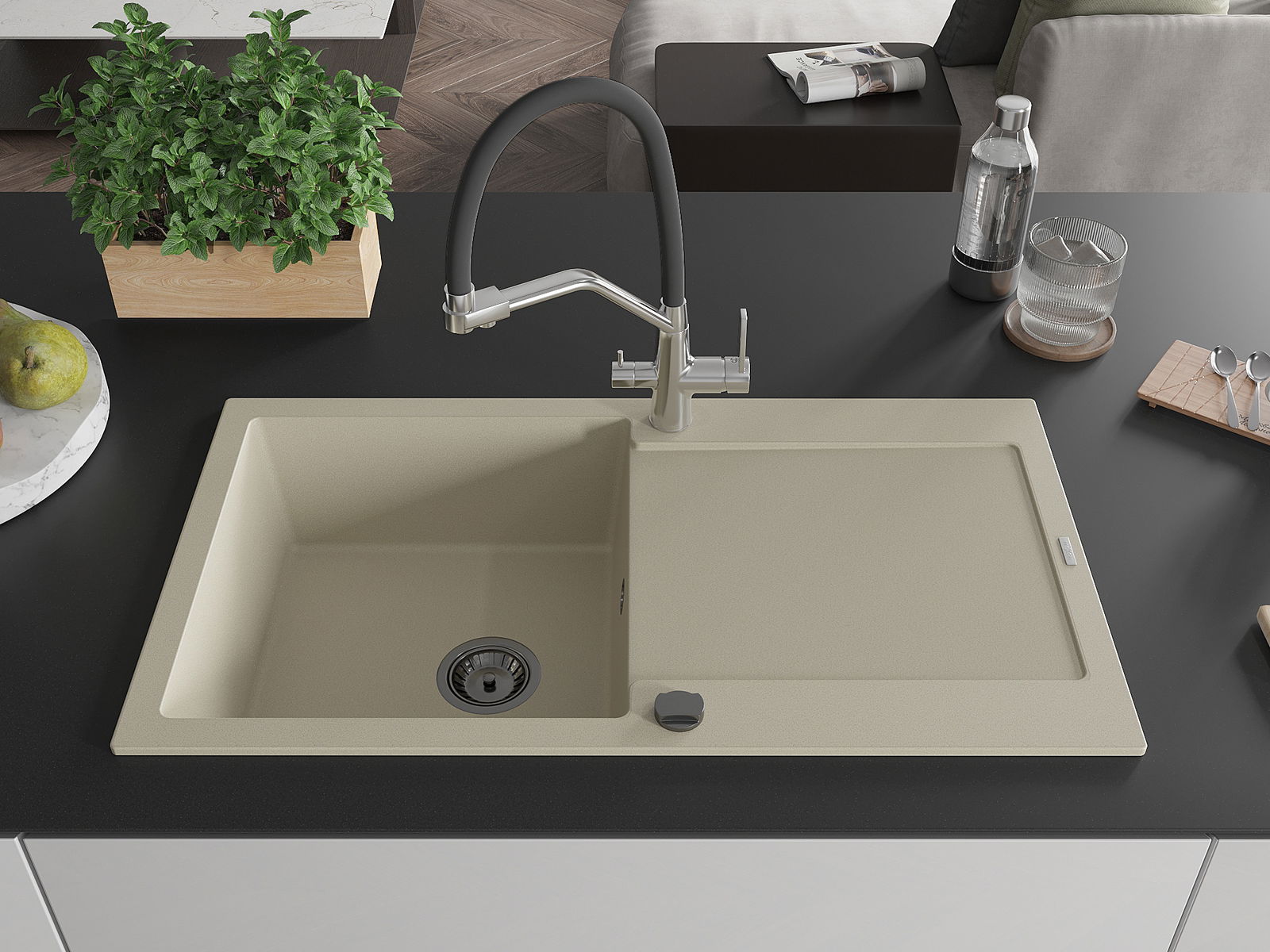 Povrch umývadla je odolný voči škvrnám a sfarbeniu, vďaka čomu sa ľahko čistí a zachováva si svoju farbu po dlhú dobu. Estetický a prakticky dopĺňajúci každú kuchyňu.