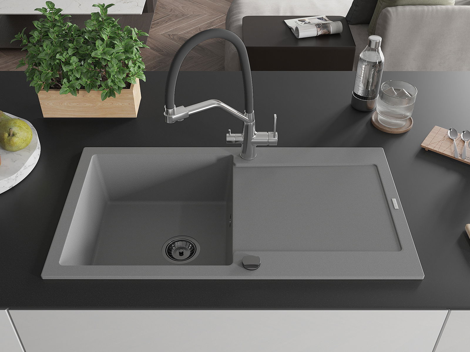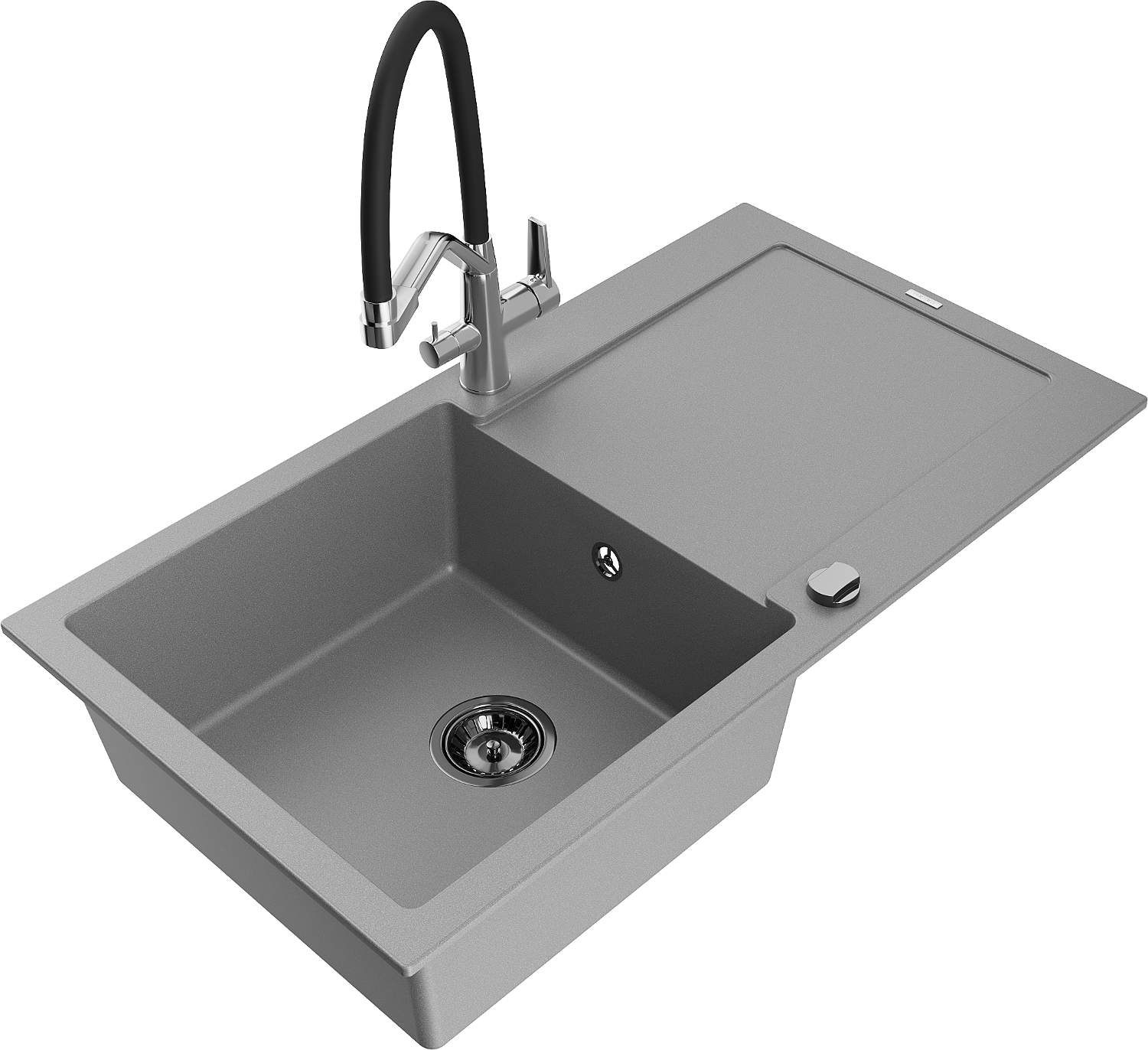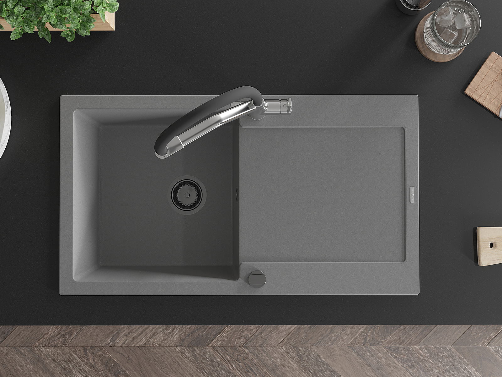 Mexen Leo žulový kuchynský drez 1-komorový s odkvapkávacou plochou a kuchynskou batériou Duo, sivý - 6501-71-671701-07-B