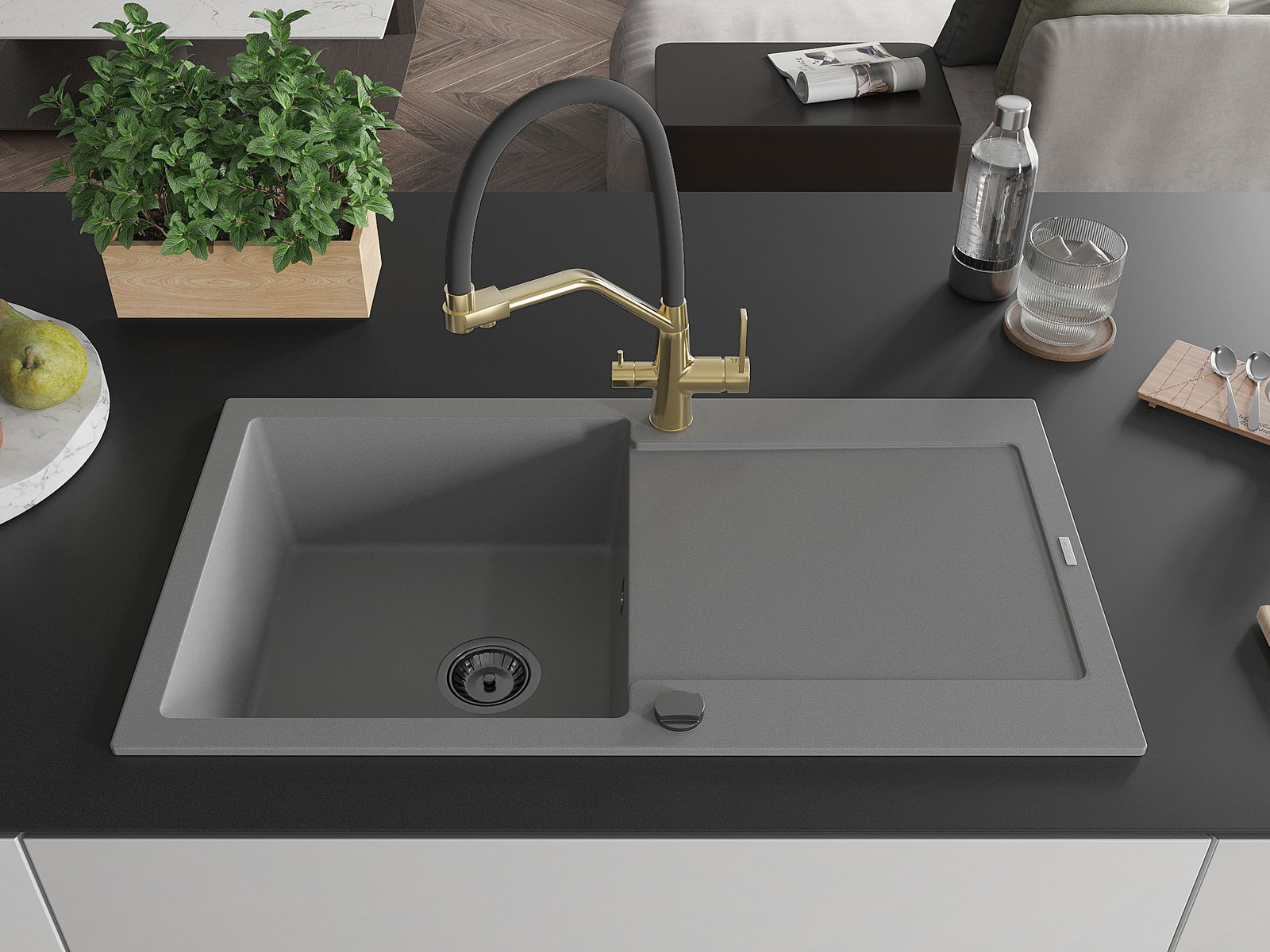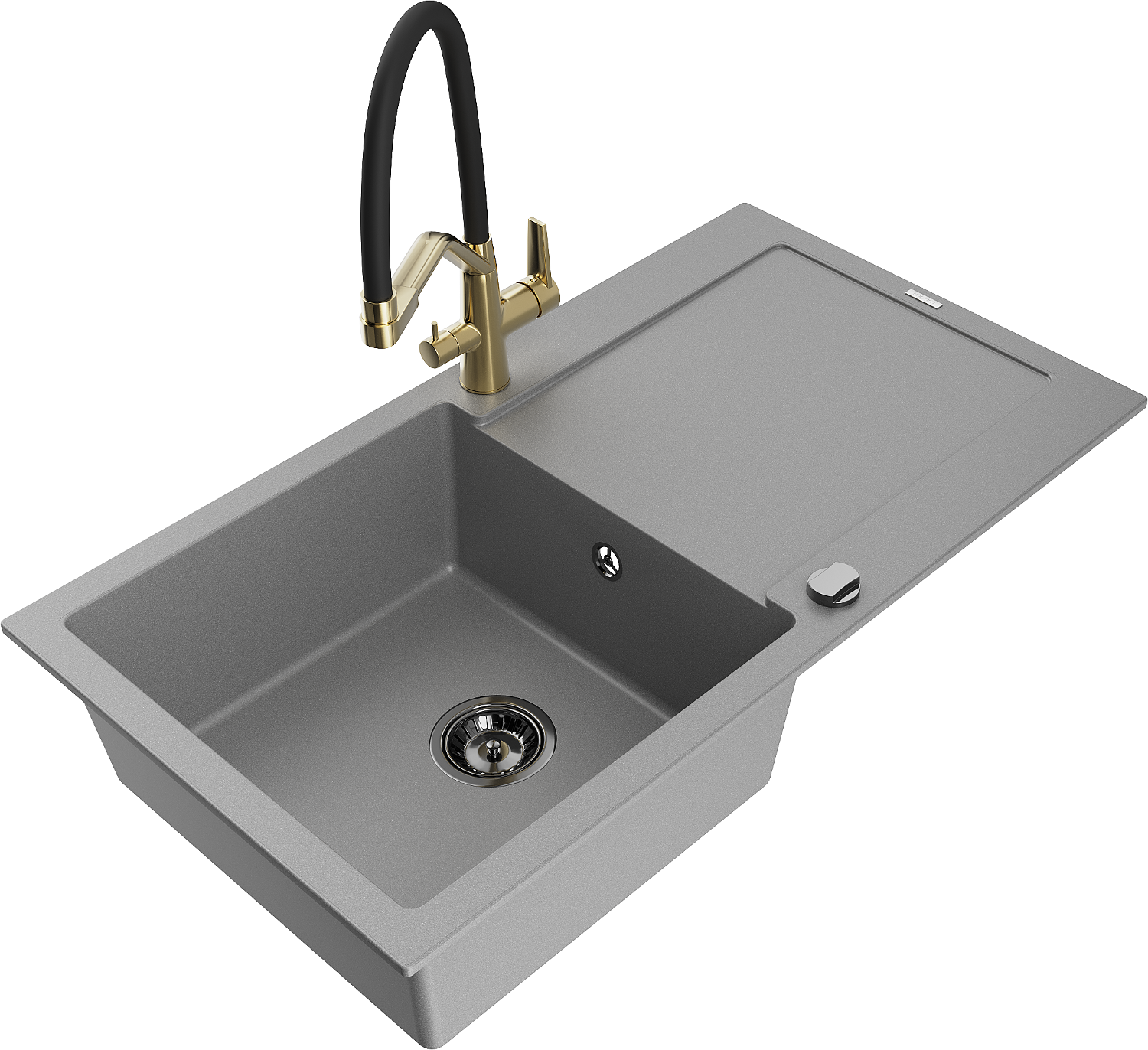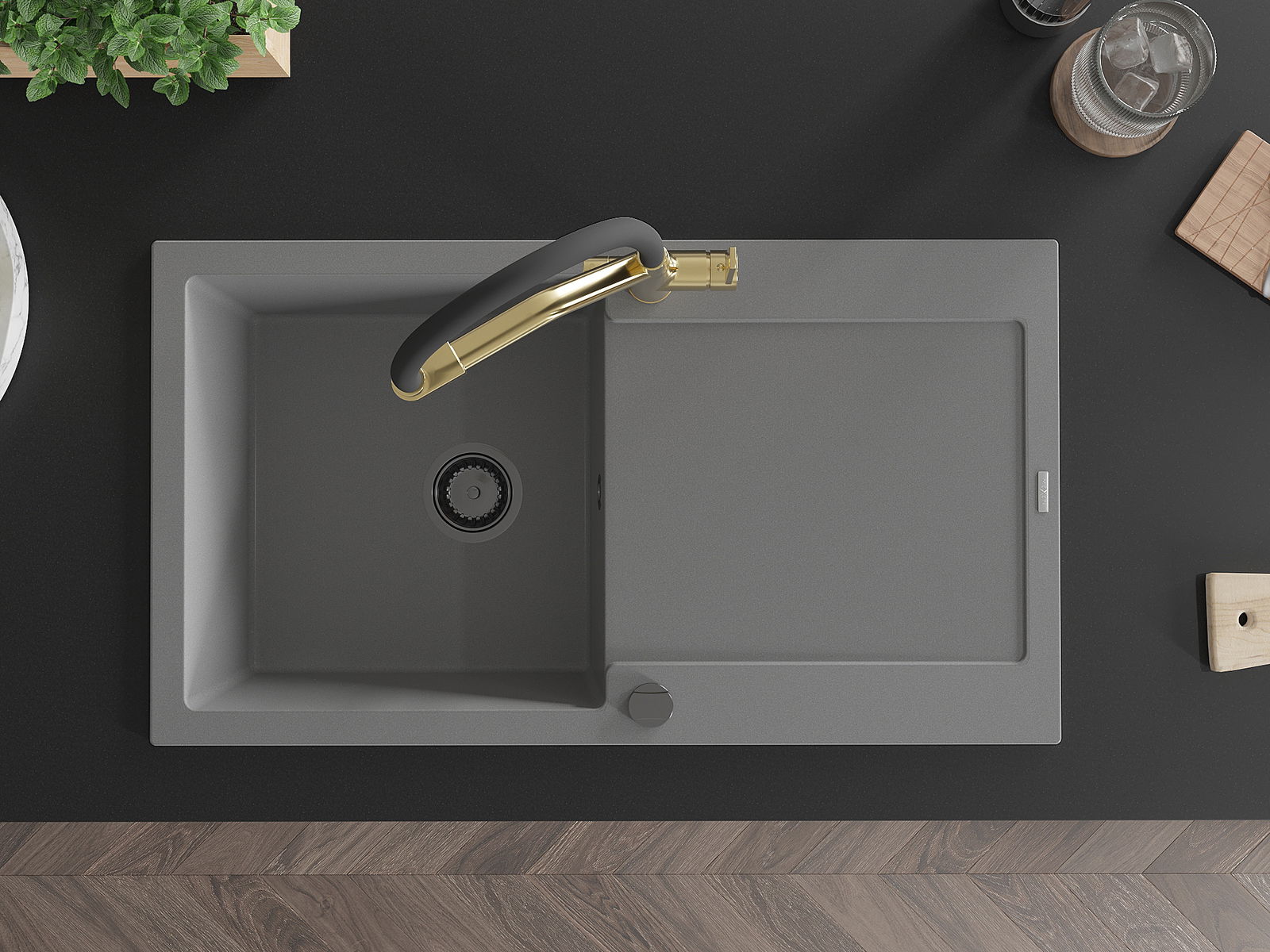 Mexen Leo žulový drez s 1 komorou a odkvapkávačom a kuchynskou batériou Duo, sivý - 6501-71-671701-57-B