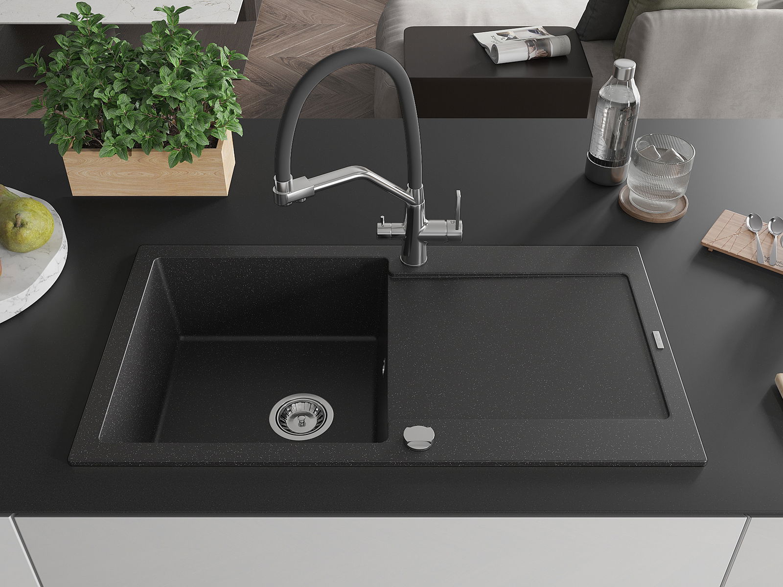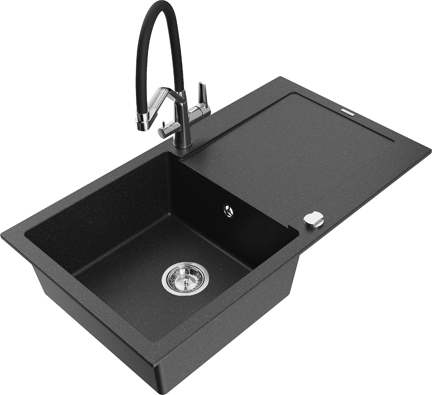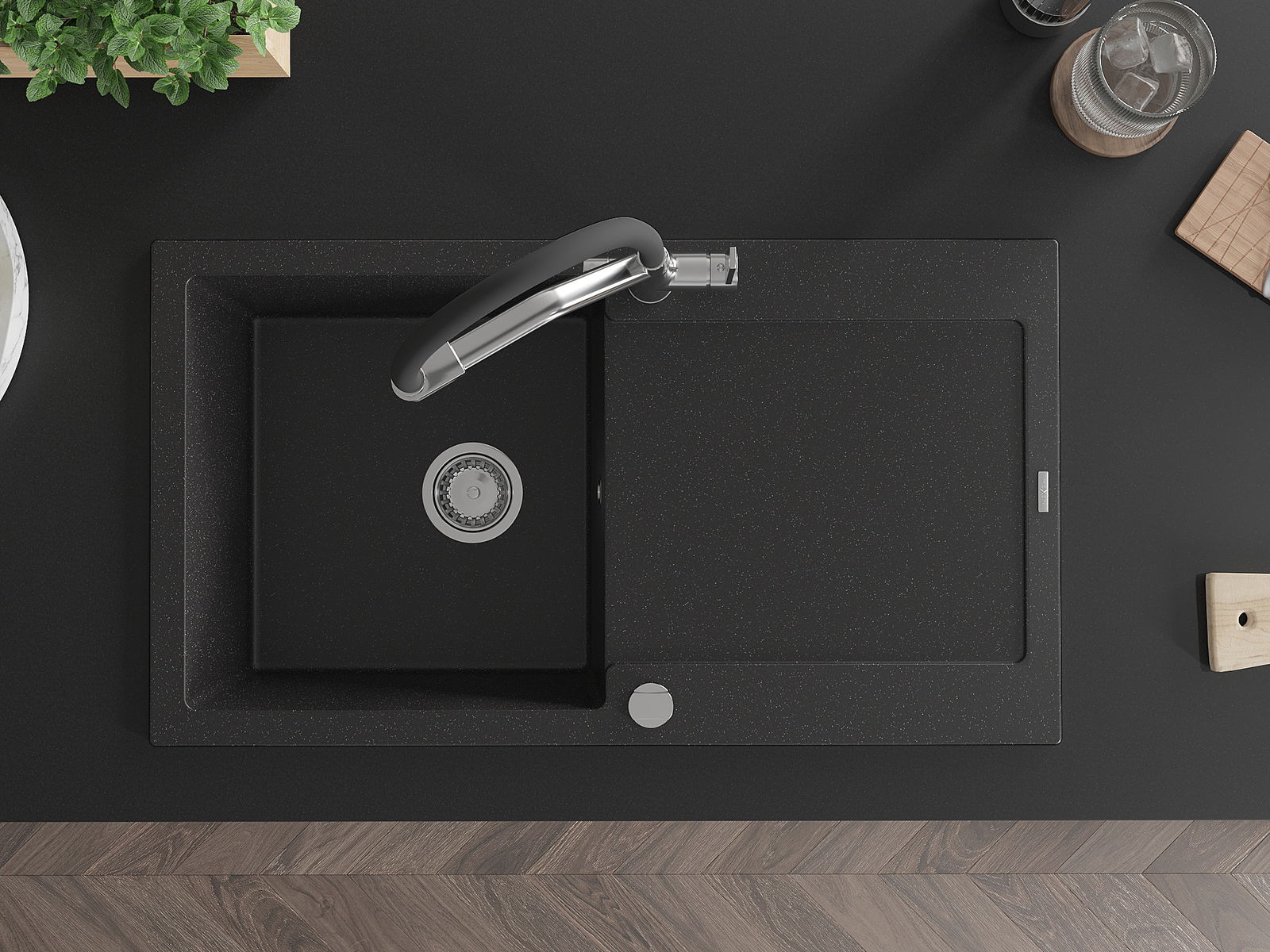 Mexen Leo jednokomorový žulový drez s odkvapkávačom a kuchynskou batériou Duo, čierny/strieborný metalický