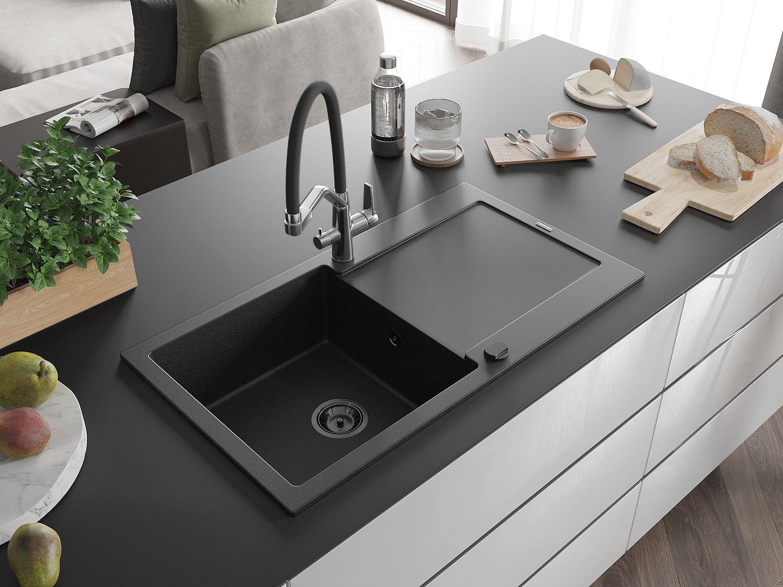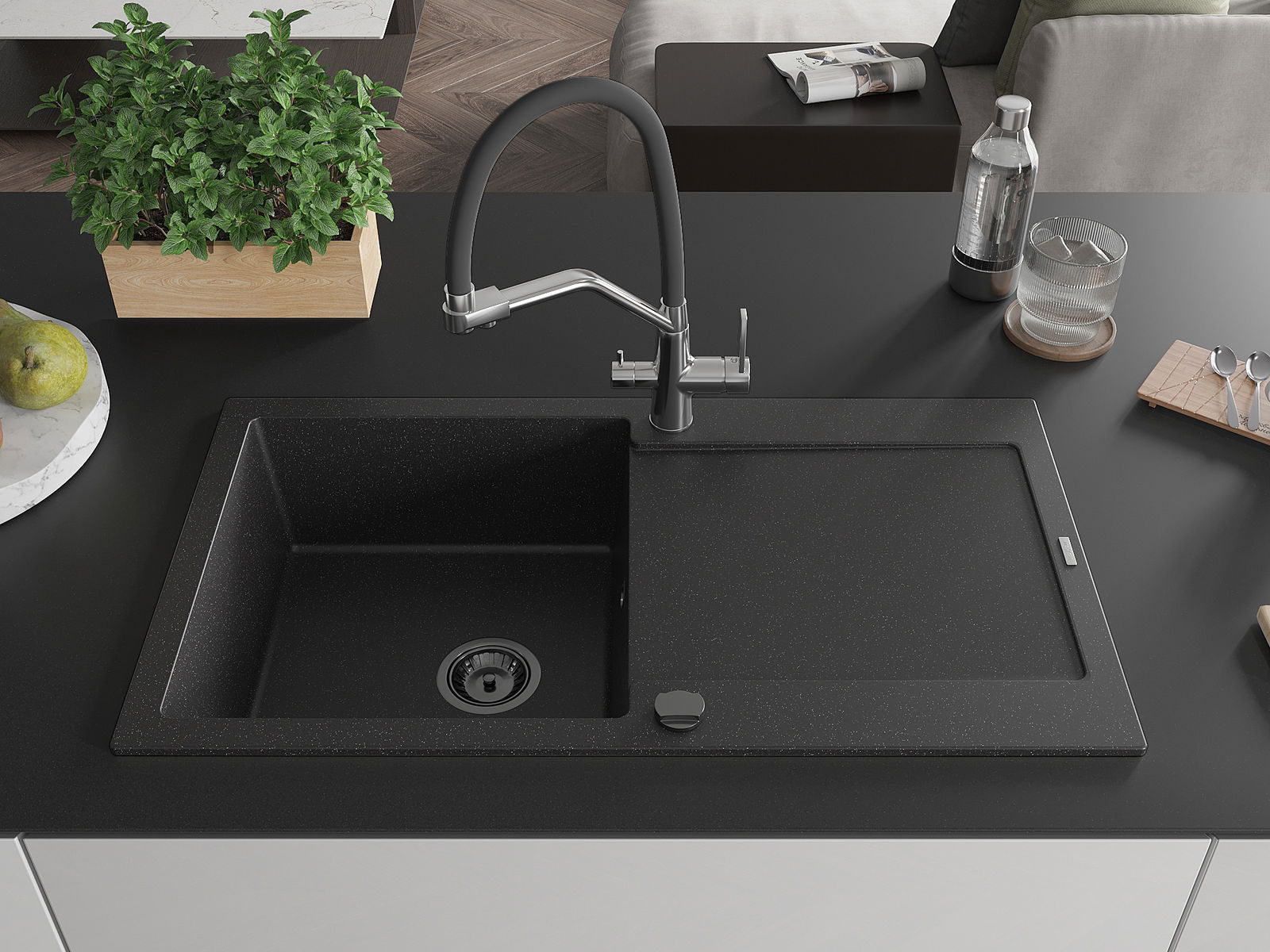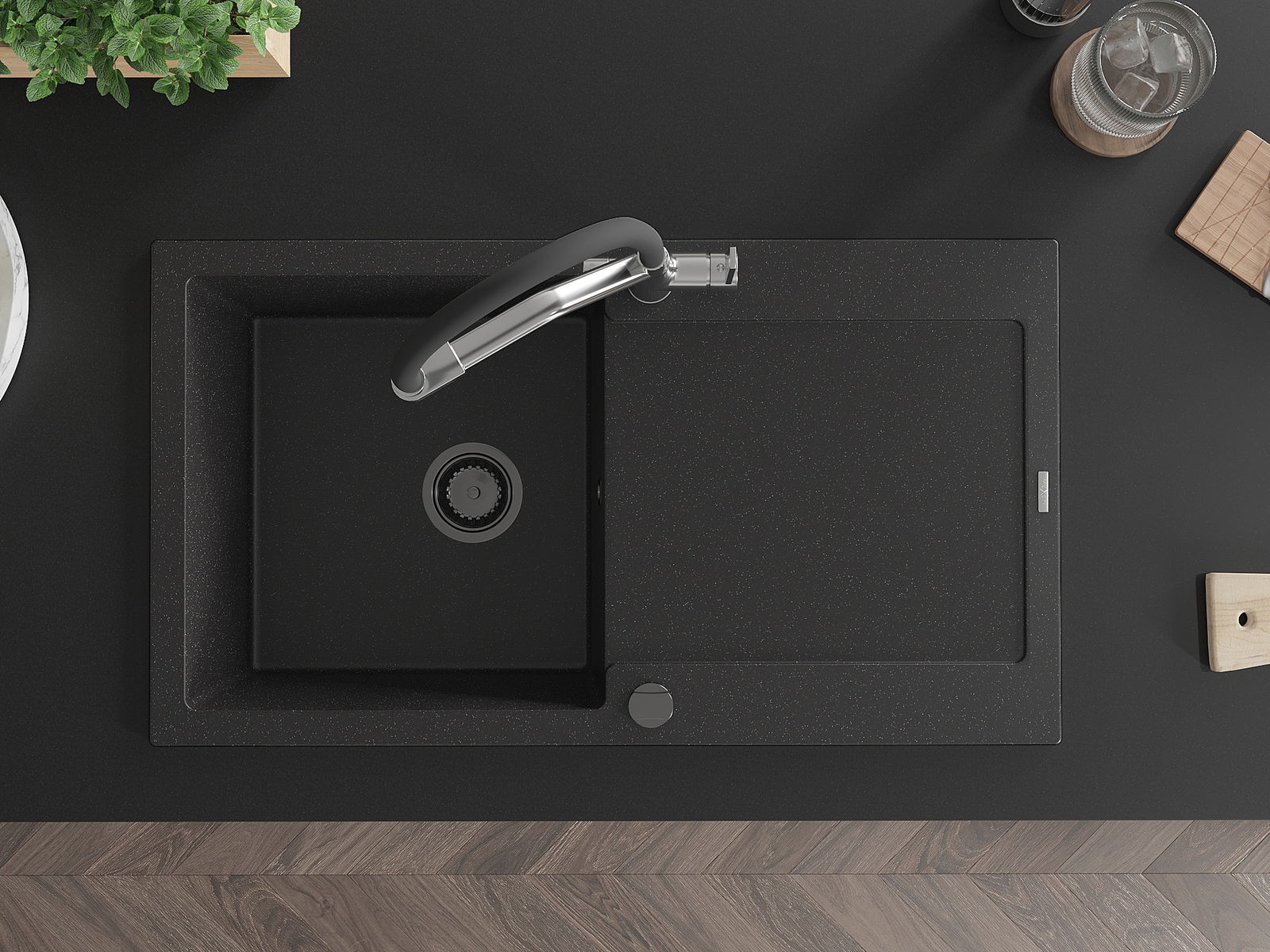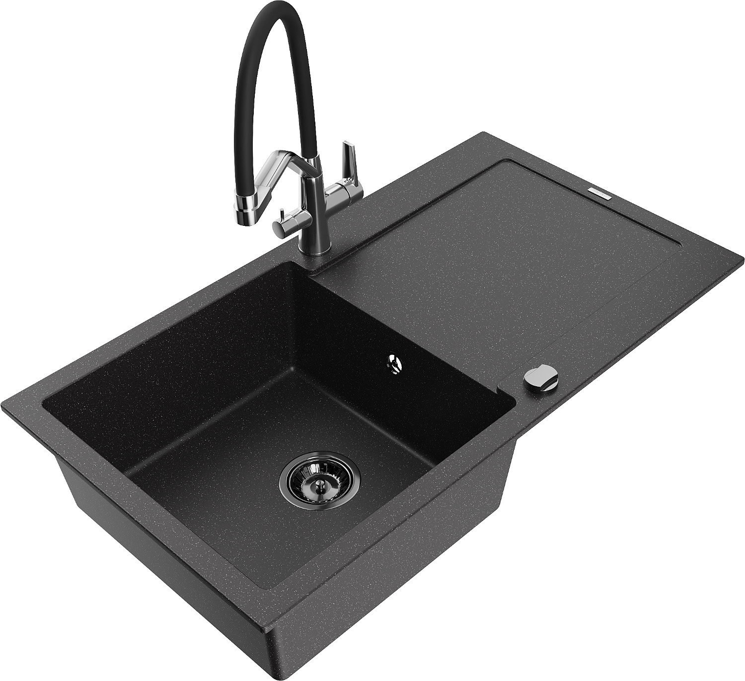 Mexen Leo granitový drez s 1 komorou, odkvapkávačom a kuchynskou batériou Duo, čierny/strieborný metalický