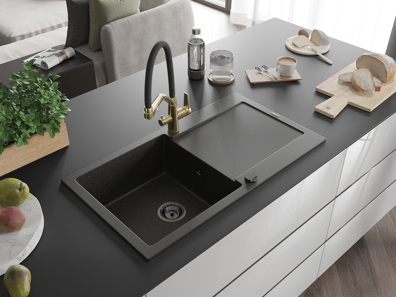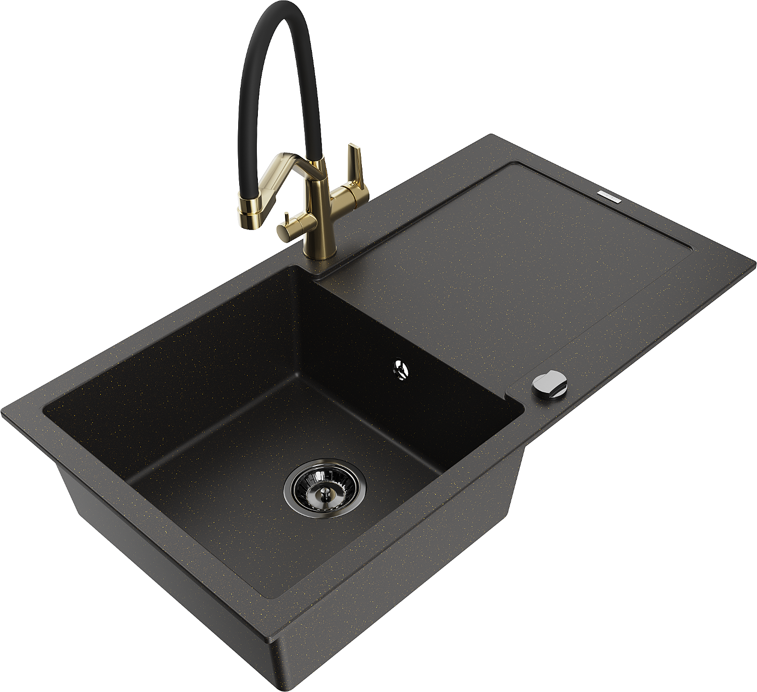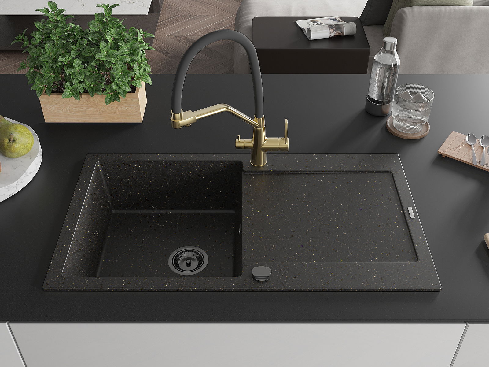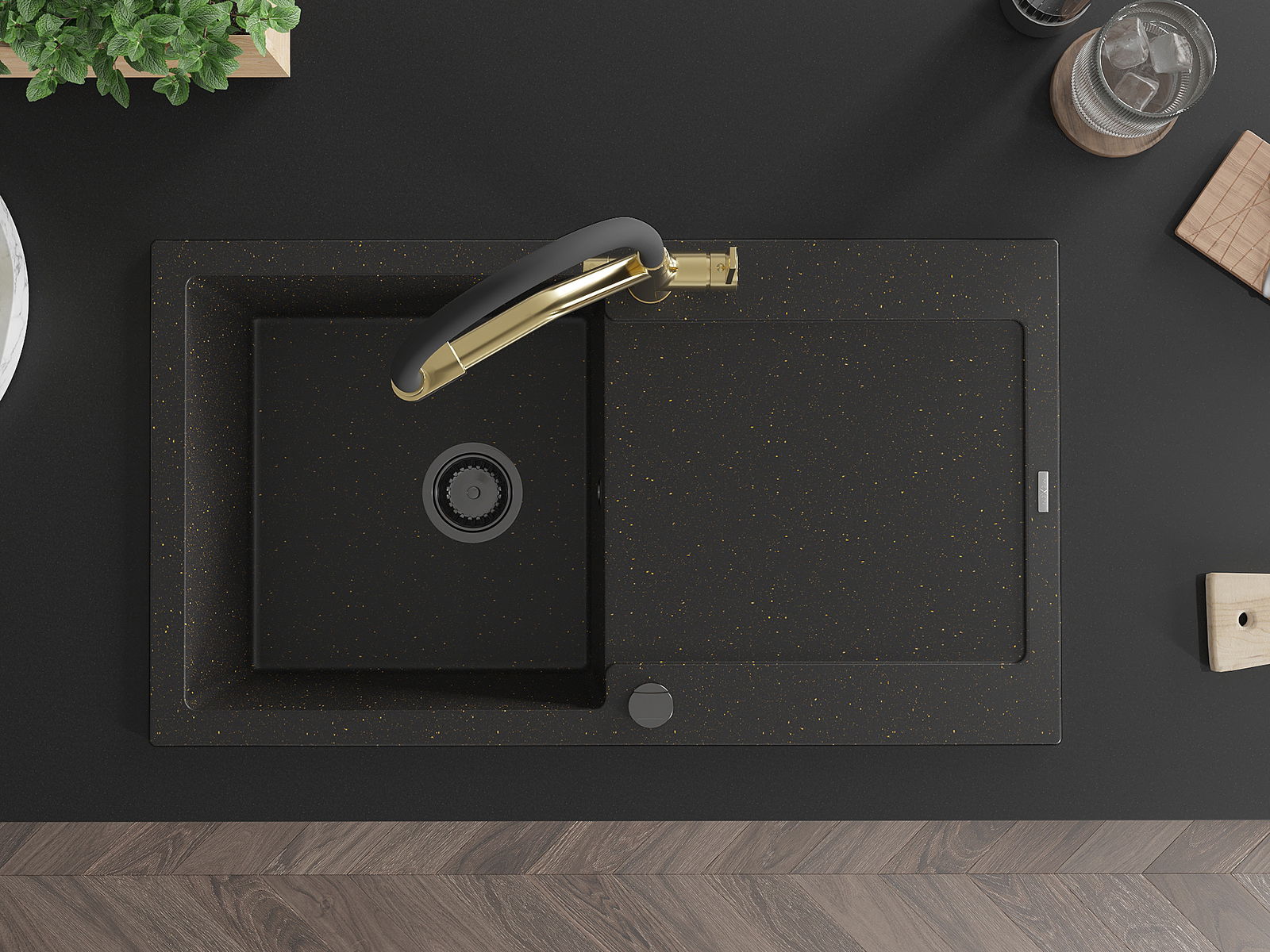 Mexen Leo granitový drez s 1 komorou s odkvapkávačom a kuchynskou batériou Duo, čierny/zlatý metalík