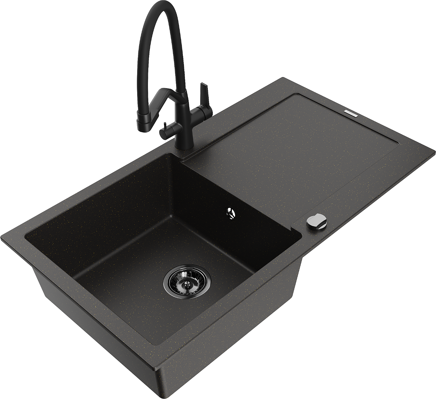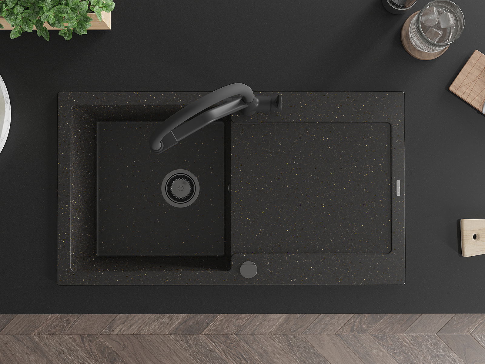 Mexen Leo granitový drez s 1 komorou, odkvapkávačom a kuchynskou batériou Duo, čierna/zlatý metalizovaný