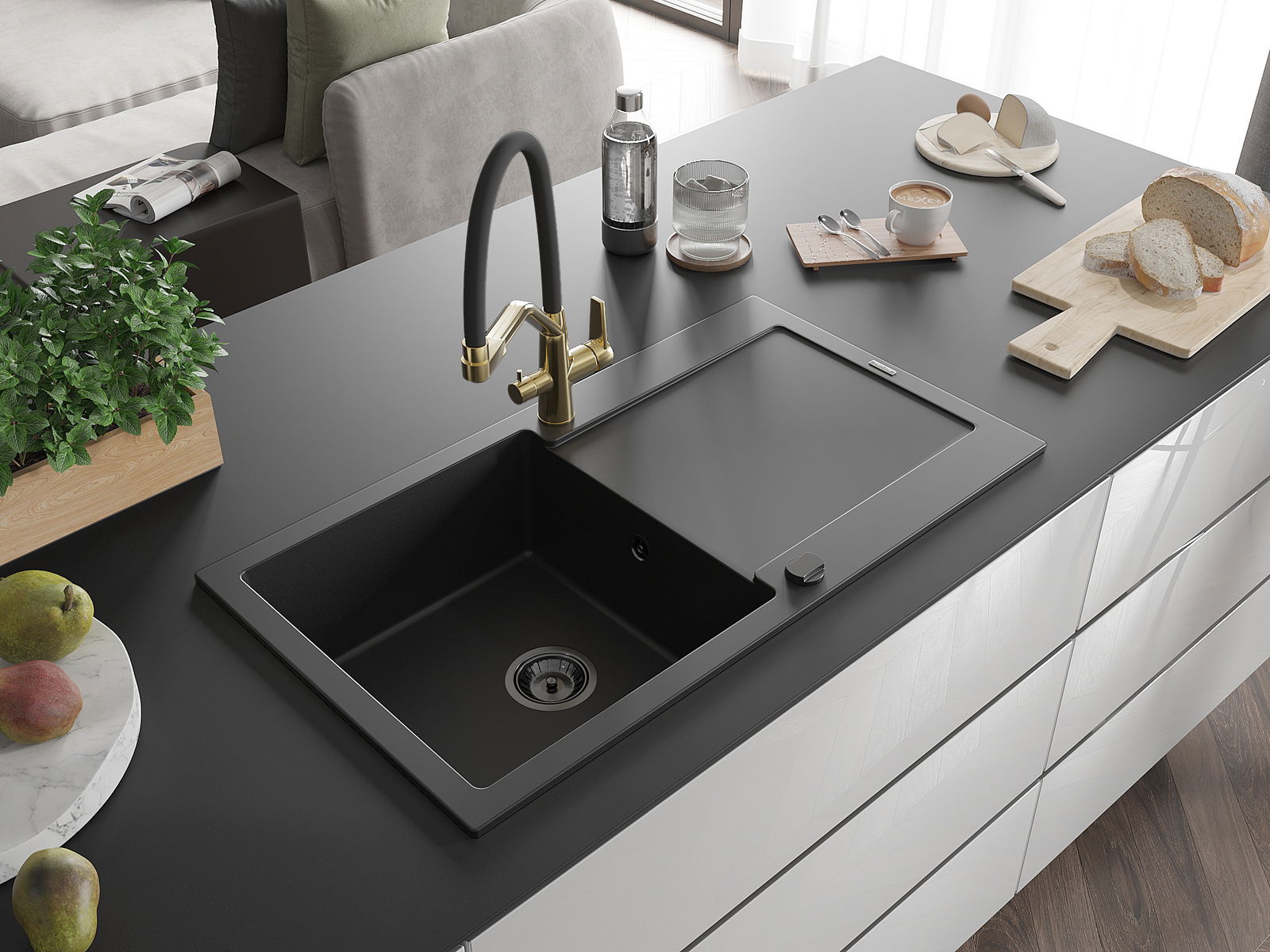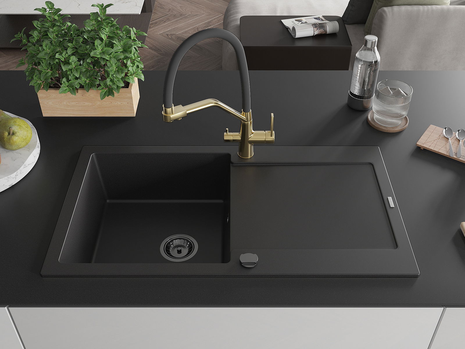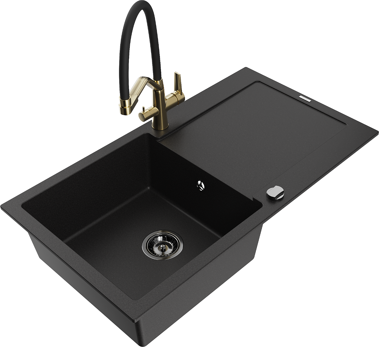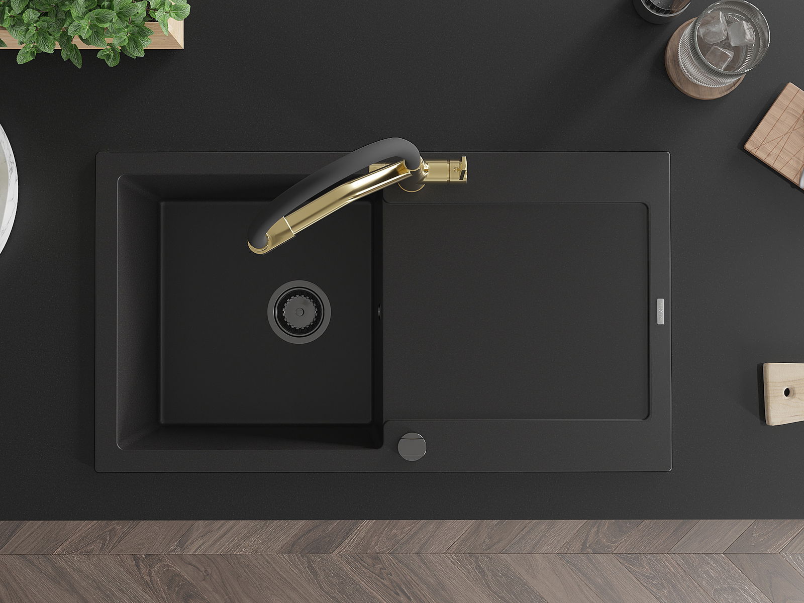 Mexen Leo granitový kuchynský drez 1-komorový s odkvapkávačom a kuchynskou batériou Duo, čierny - 6501-77-671701-57-B
