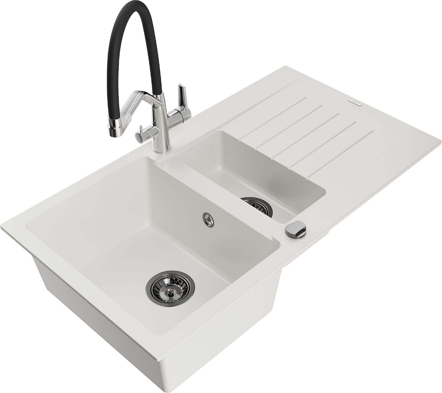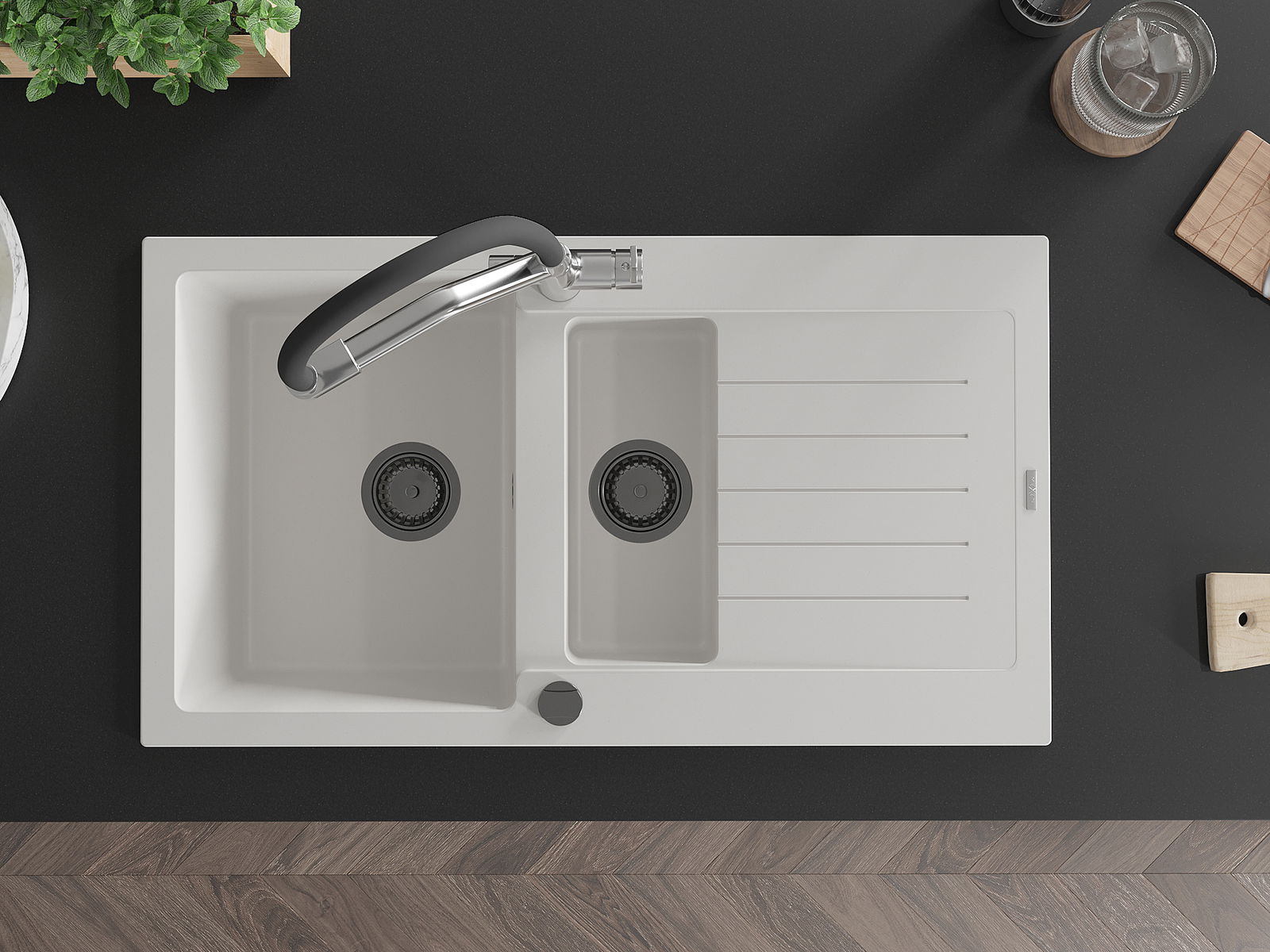 Mexen Matias granitový drez 1,5-komorový s odkvapkávačom a kuchynskou batériou Duo, biely - 6502-20-671701-07-B