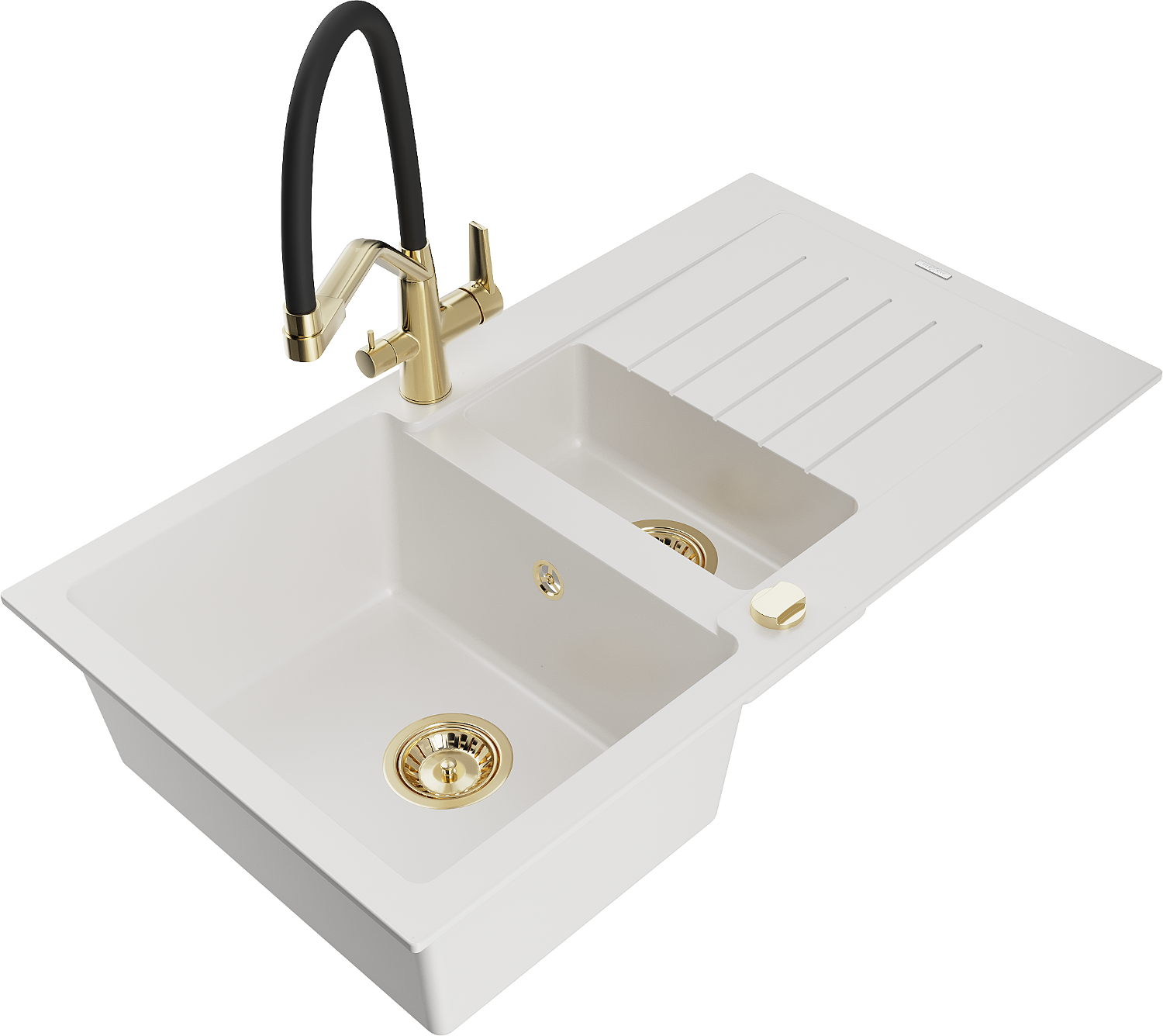 Mexen Matias granitový drez 1,5-komorový s odkvapkávačom a kuchynskou batériou Duo, biely - 6502-20-671701-57-G