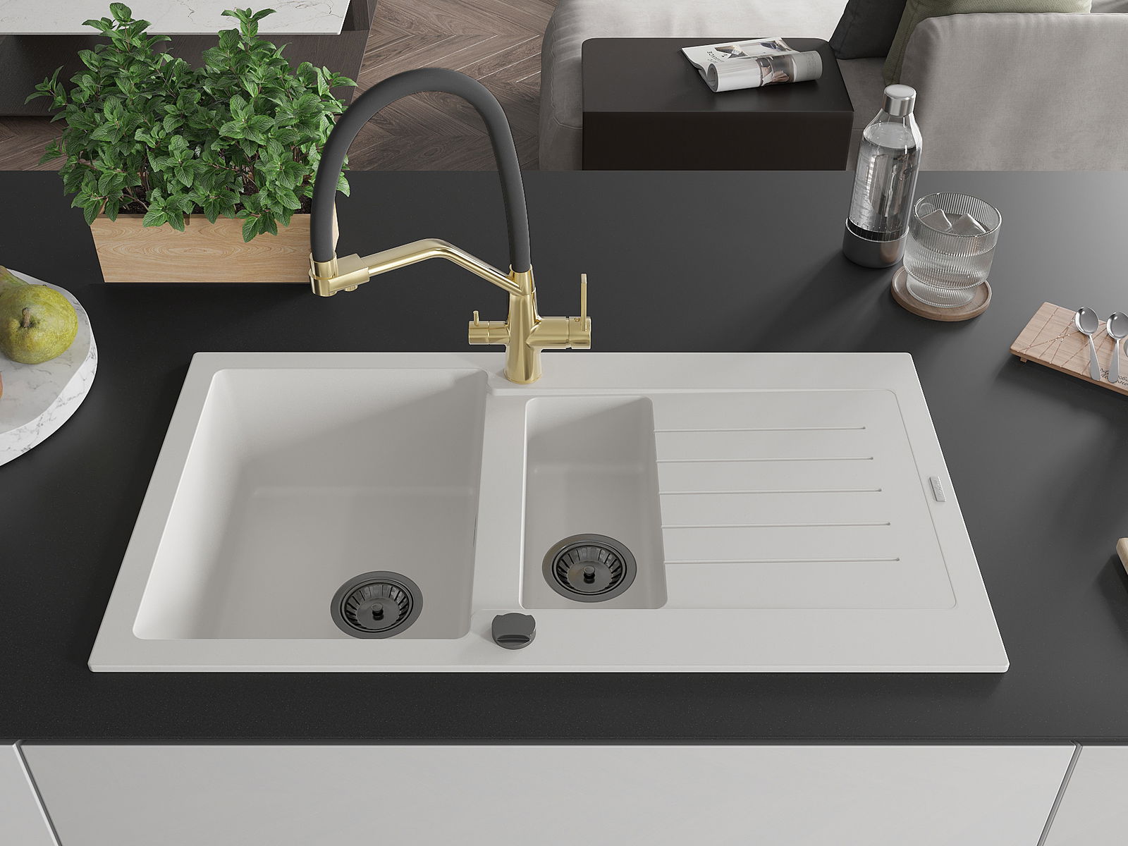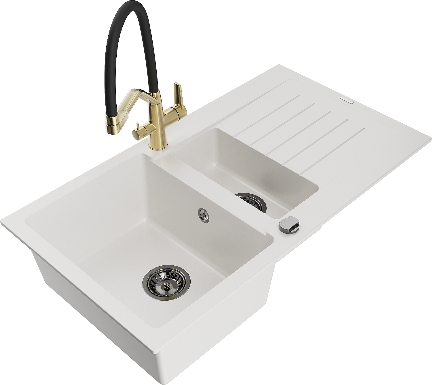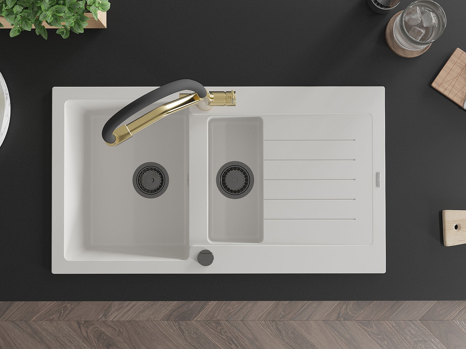 Mexen Matias žulový drez 1,5-komorový s odkvapkávačom a kuchynskou batériou Duo, biely - 6502-20-671701-57-B
