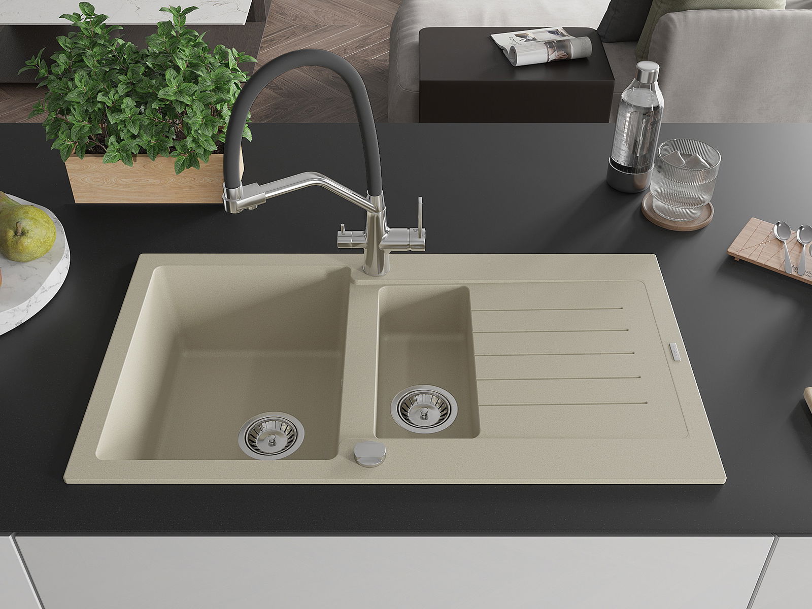 Mexen Matias žulový drez, 1,5-komorový so sušičkou a kuchynskou batériou Duo, béžový - 6502-69-671701-07