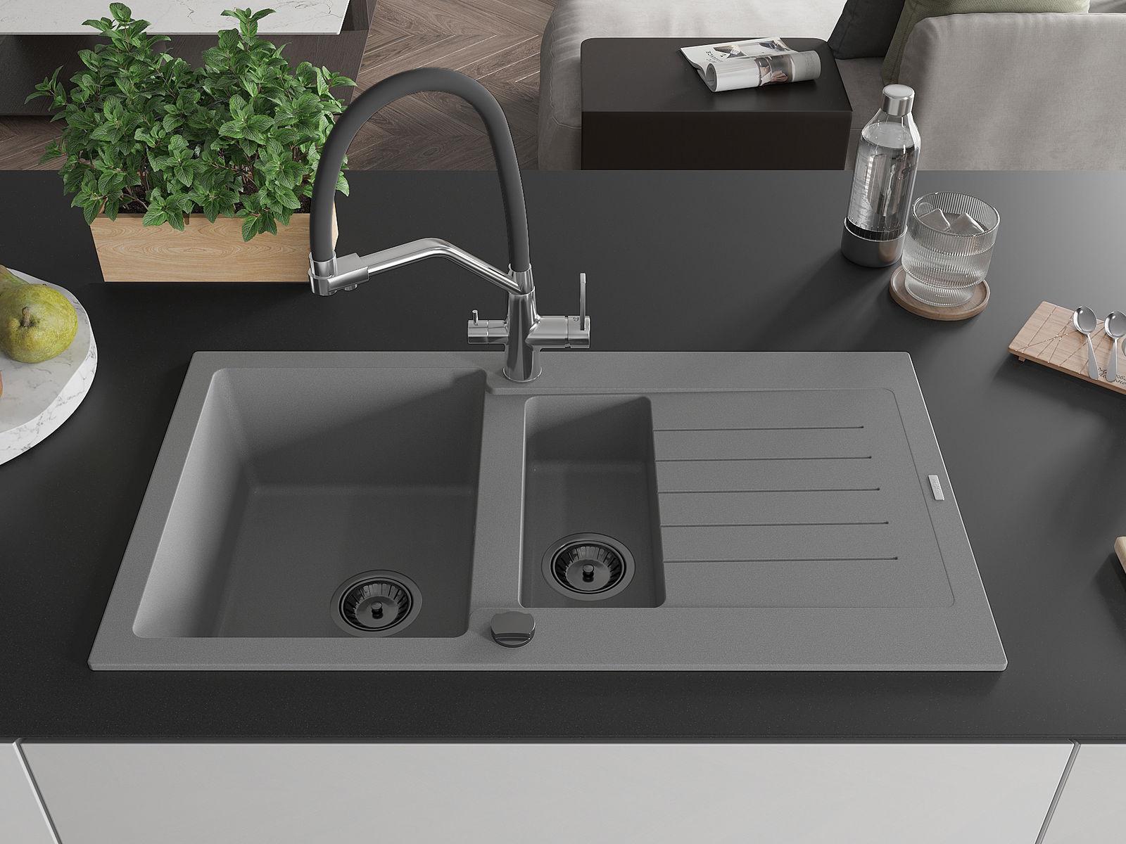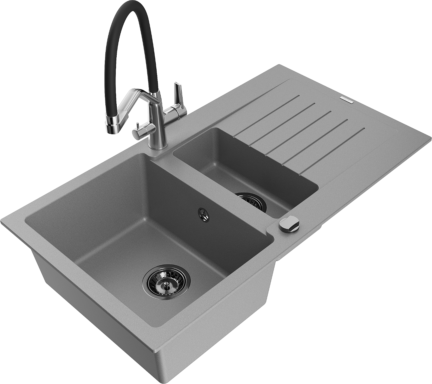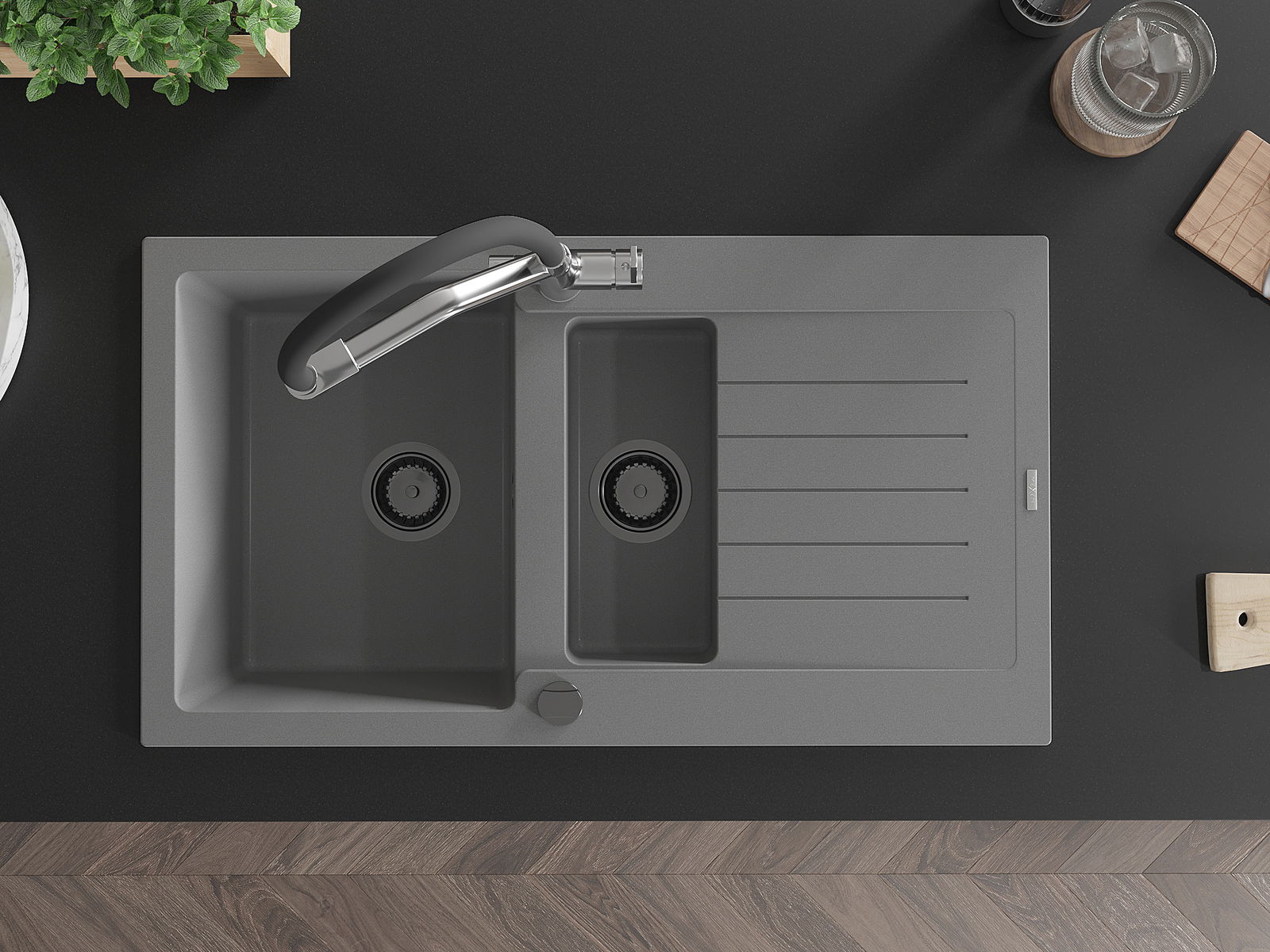 Mexen Matias žulový drez 1,5-komorový s odkvapkávačom a kuchynskou batériou Duo, sivý - 6502-71-671701-07-B