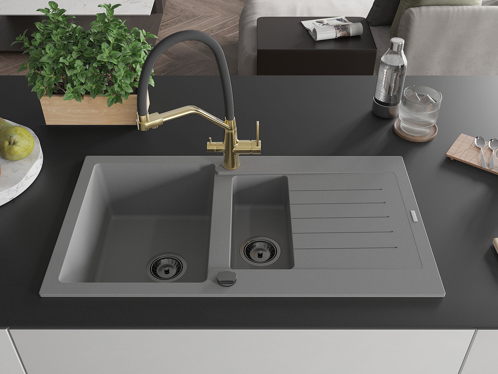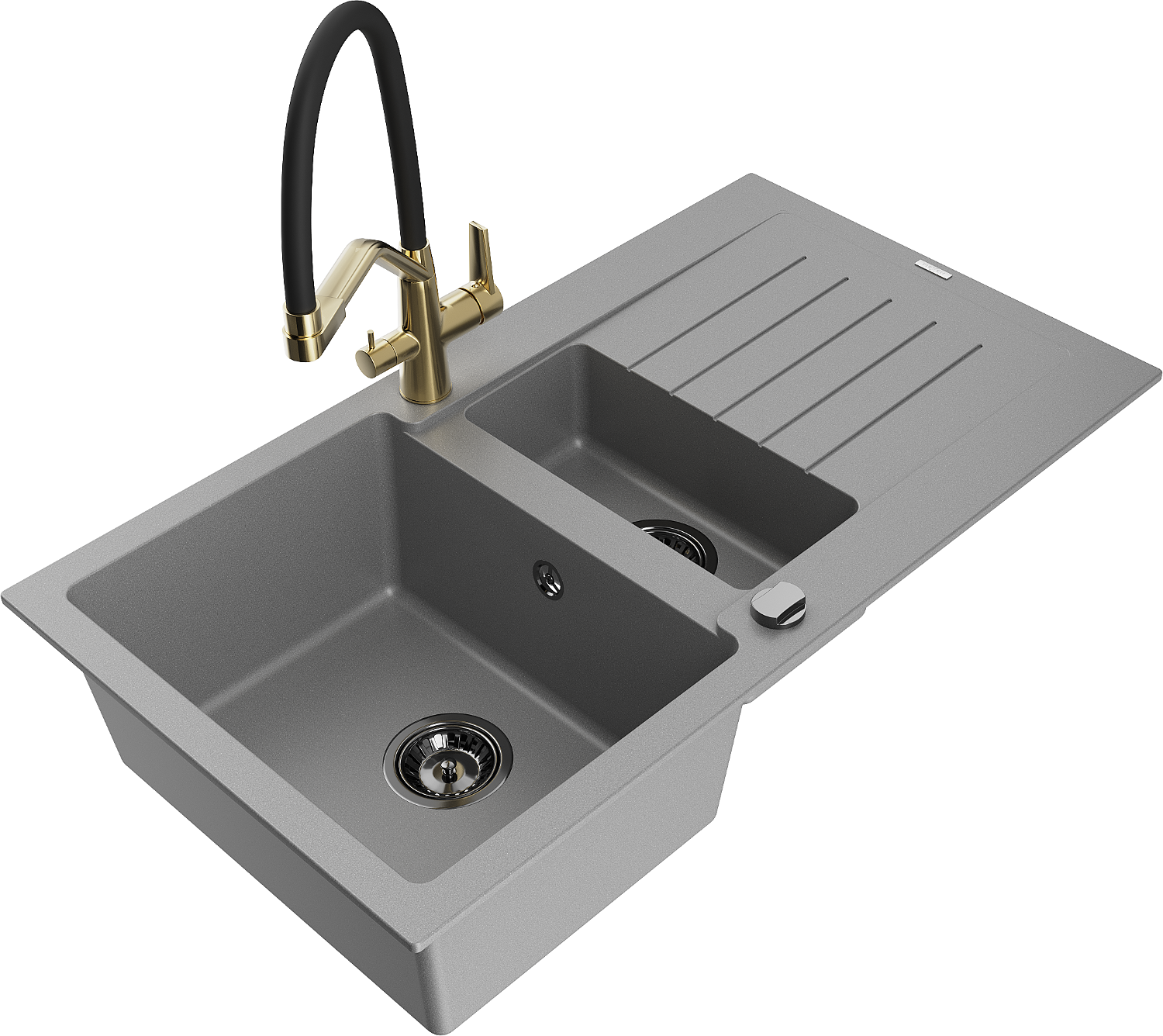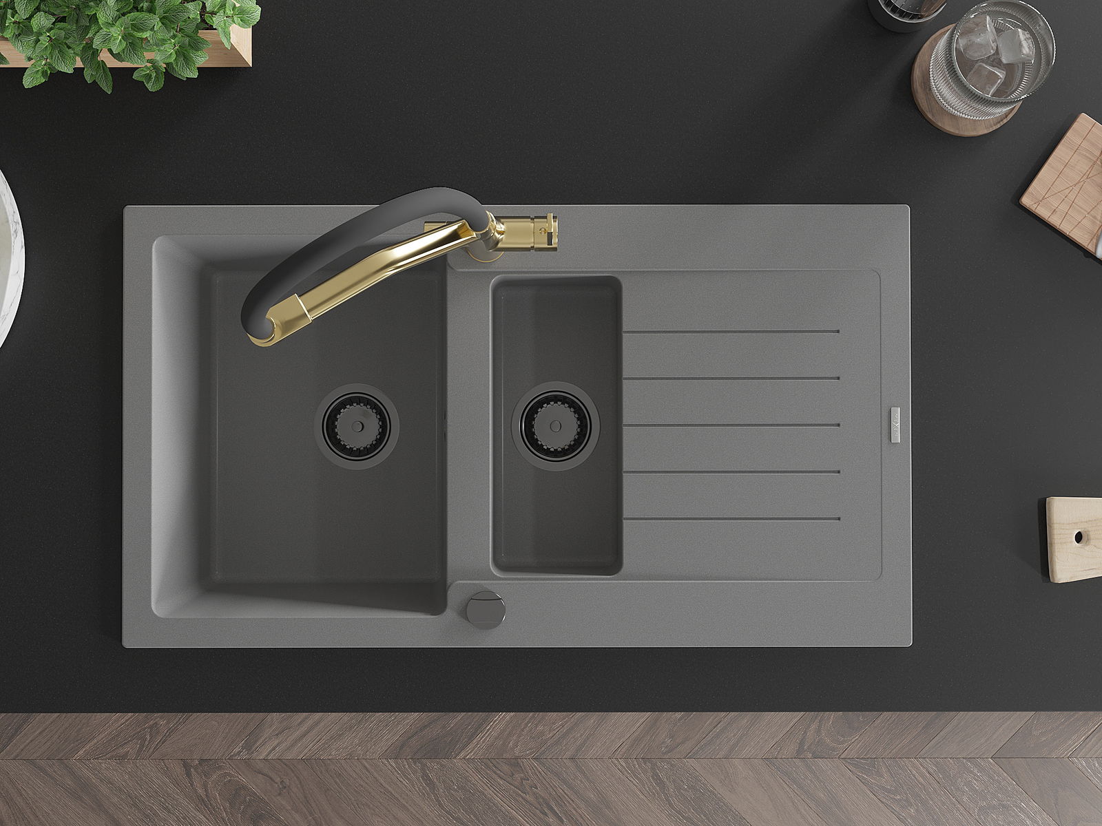 Mexen Matias žulový drez 1,5-komorový s odkvapkávačom a kuchynskou batériou Duo, sivý - 6502-71-671701-57-B