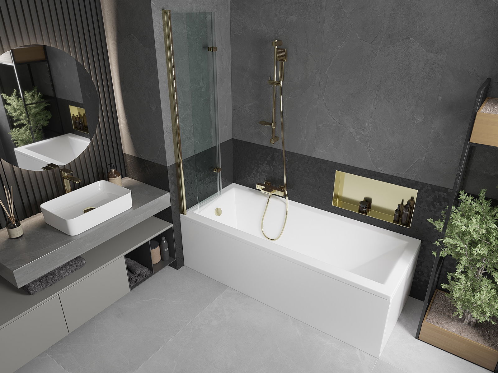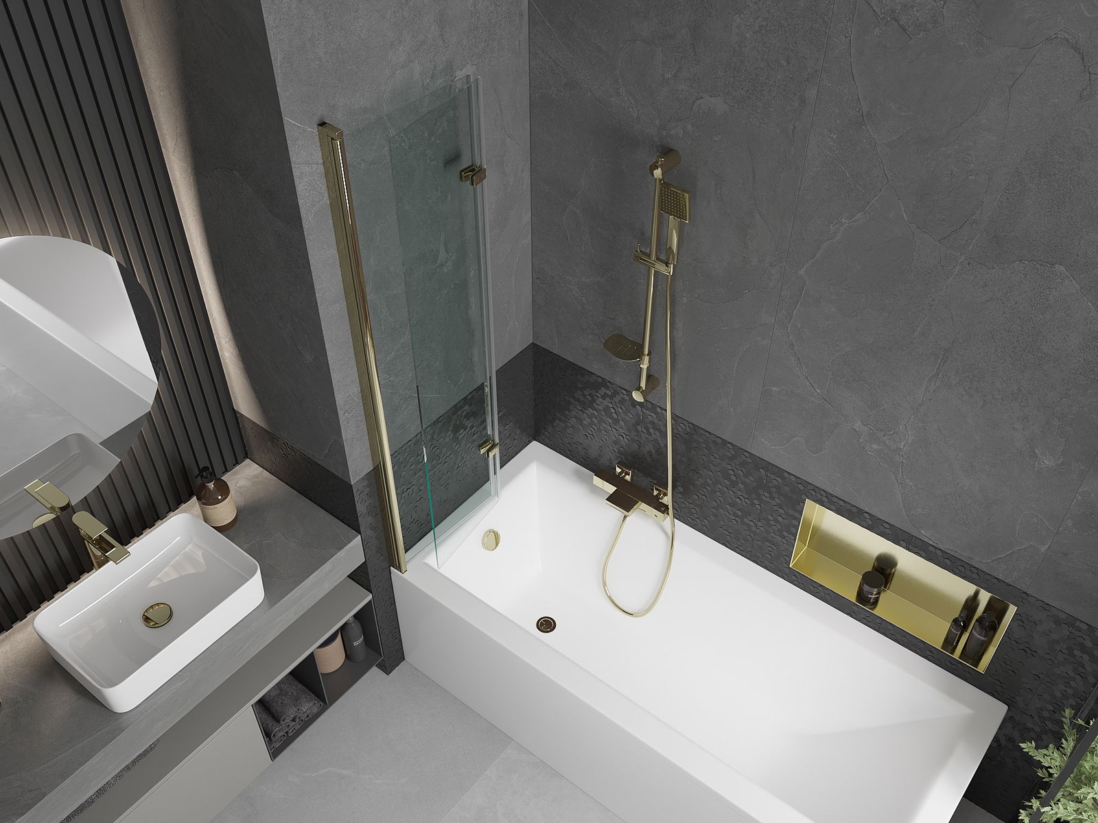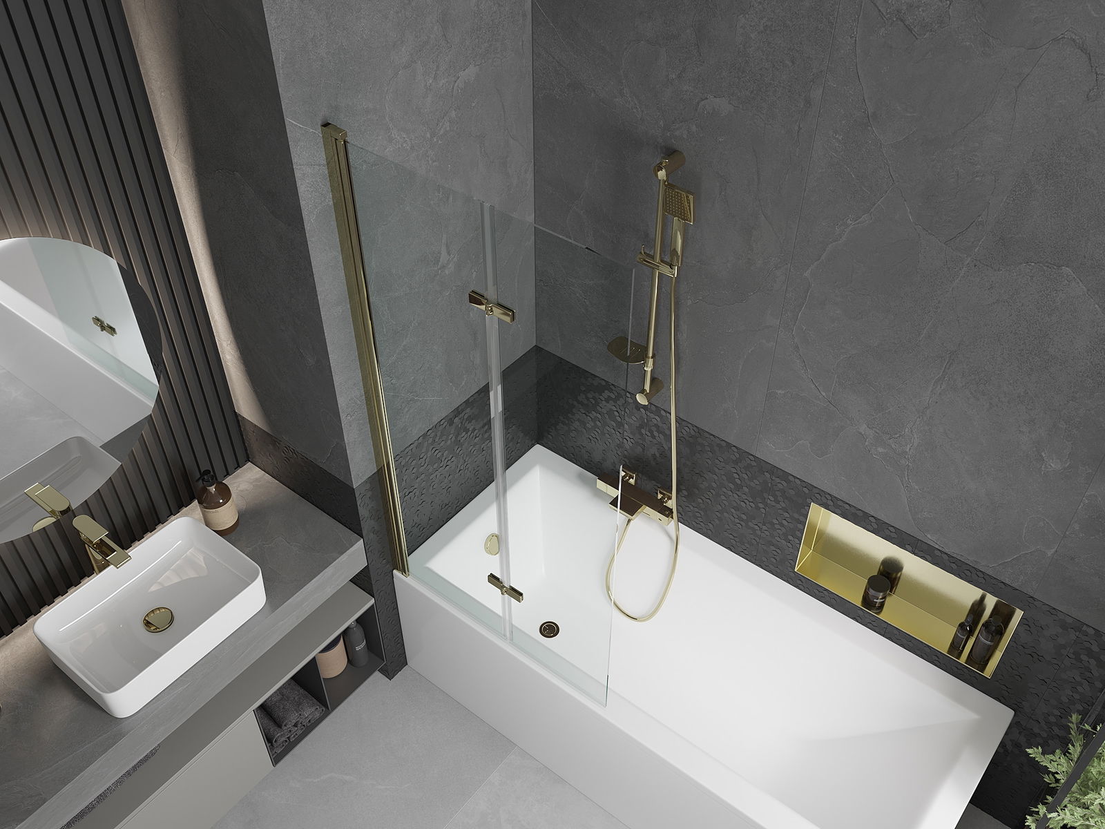Obrazovka je vyrobená z dvoch krídel s možnosťou skladania. Toto riešenie šetrí viac priestoru v kúpeľni a umožňuje vám voľne využívať zvyšný priestor, keď nepoužívame kúpaciu oblasť.