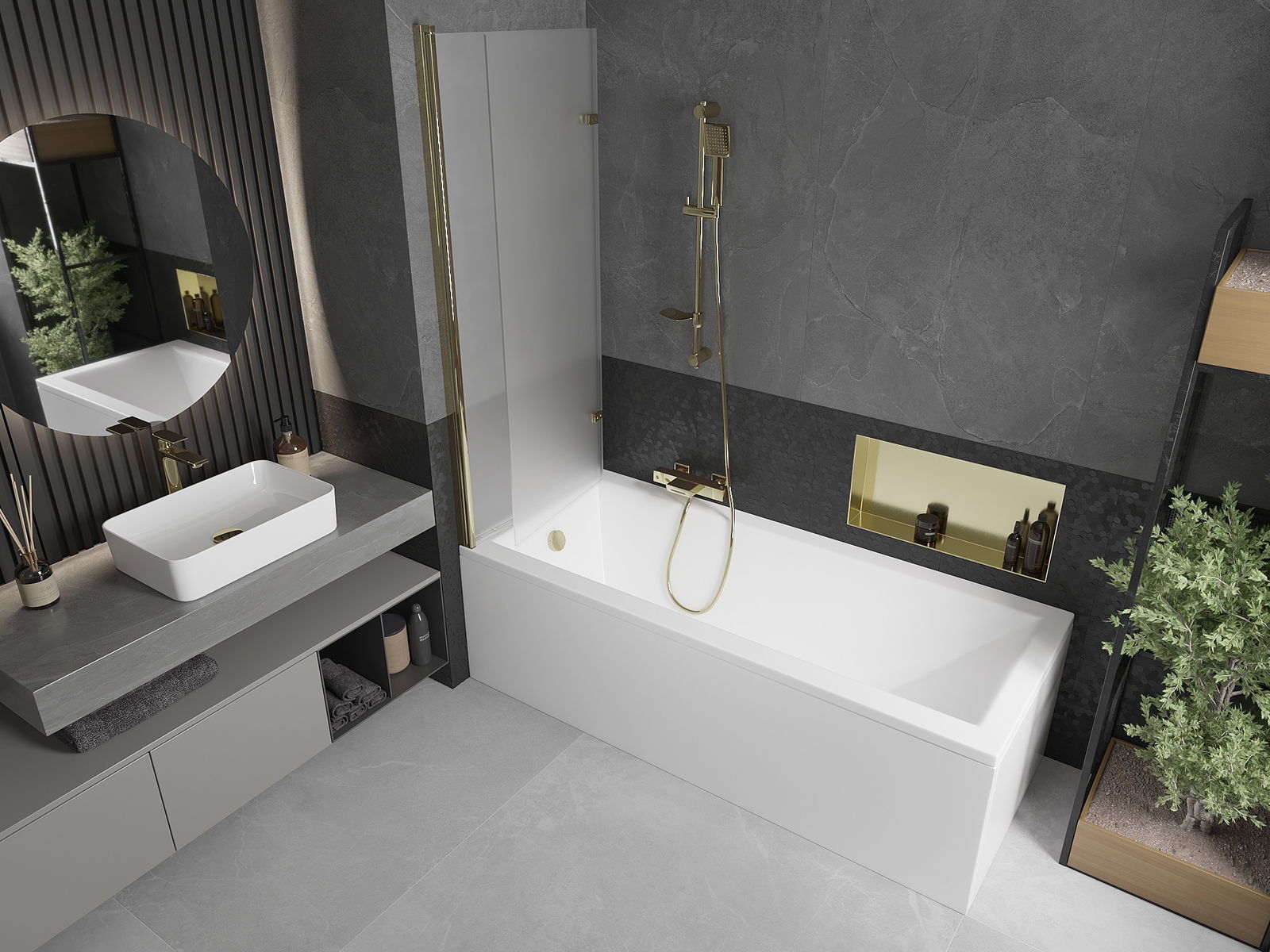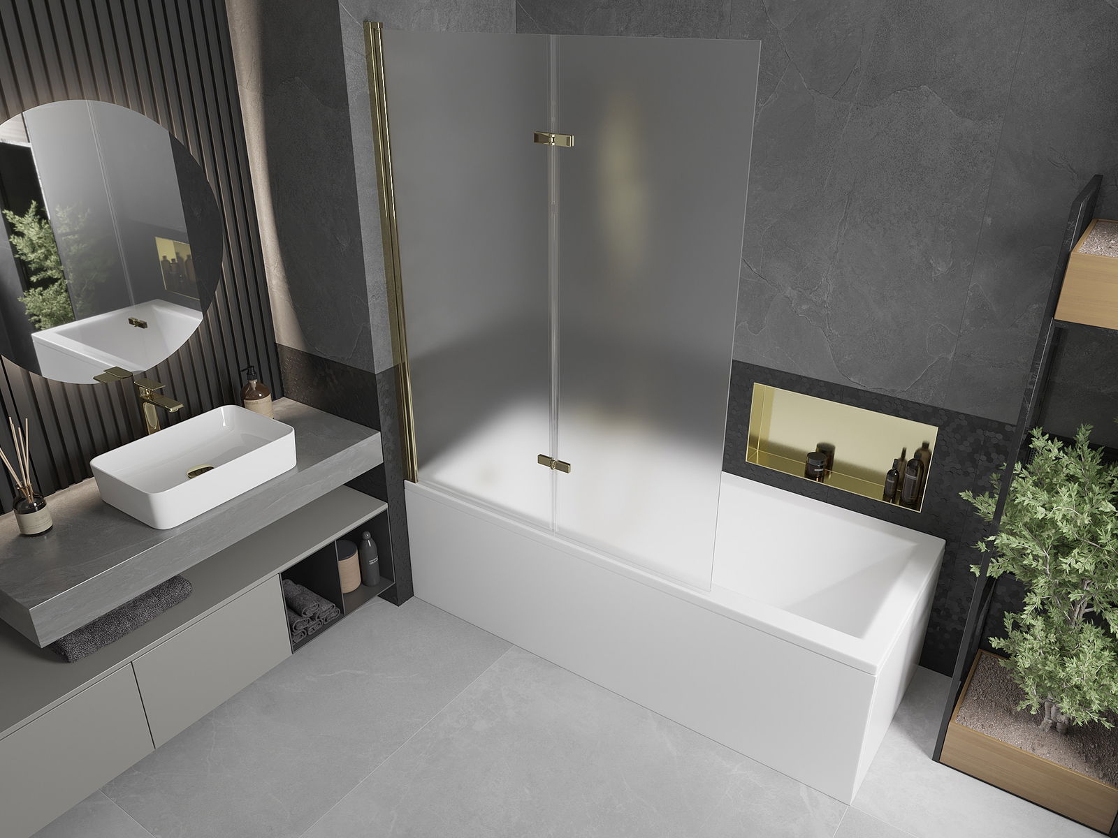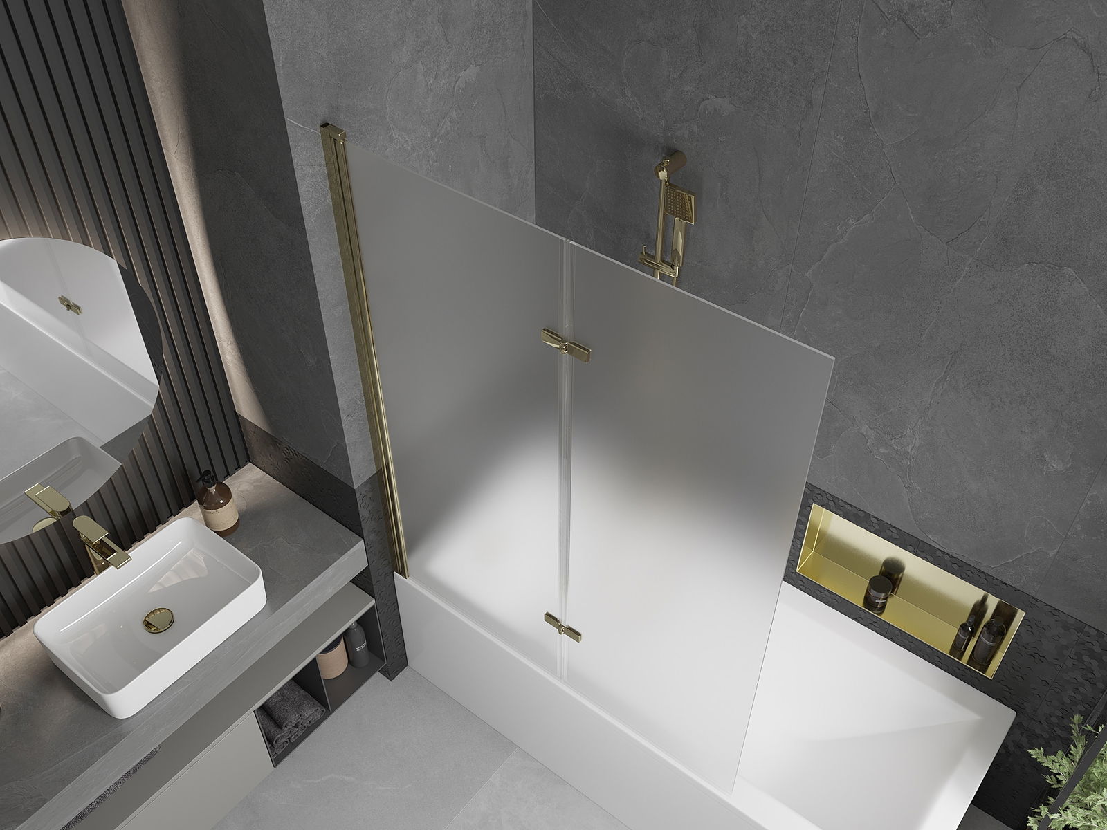 Obrazovka je vyrobená z dvoch krídel s možnosťou skladania. Toto riešenie šetrí viac priestoru v kúpeľni a umožňuje vám voľne využívať zvyšný priestor, keď nepoužívame kúpaciu oblasť.