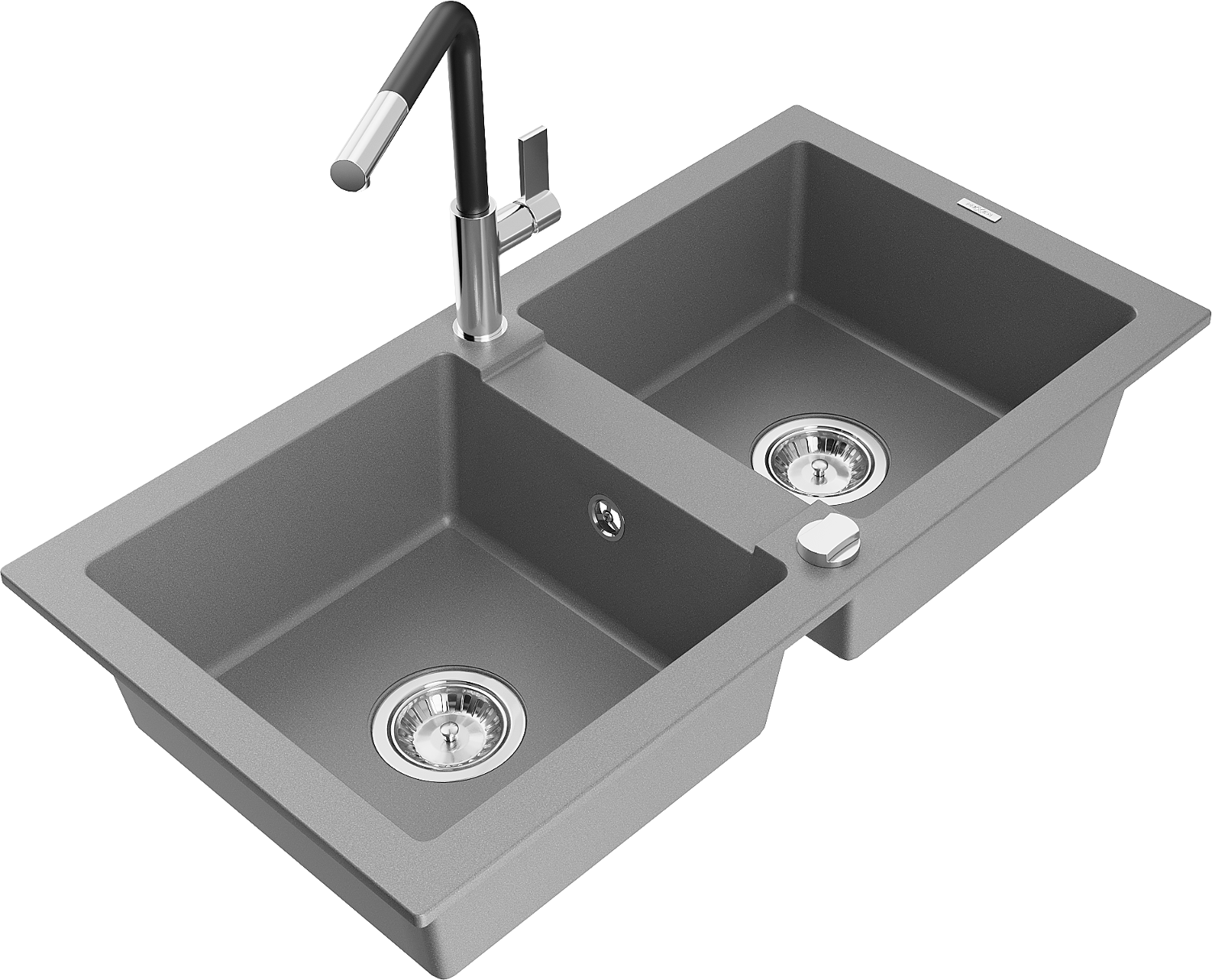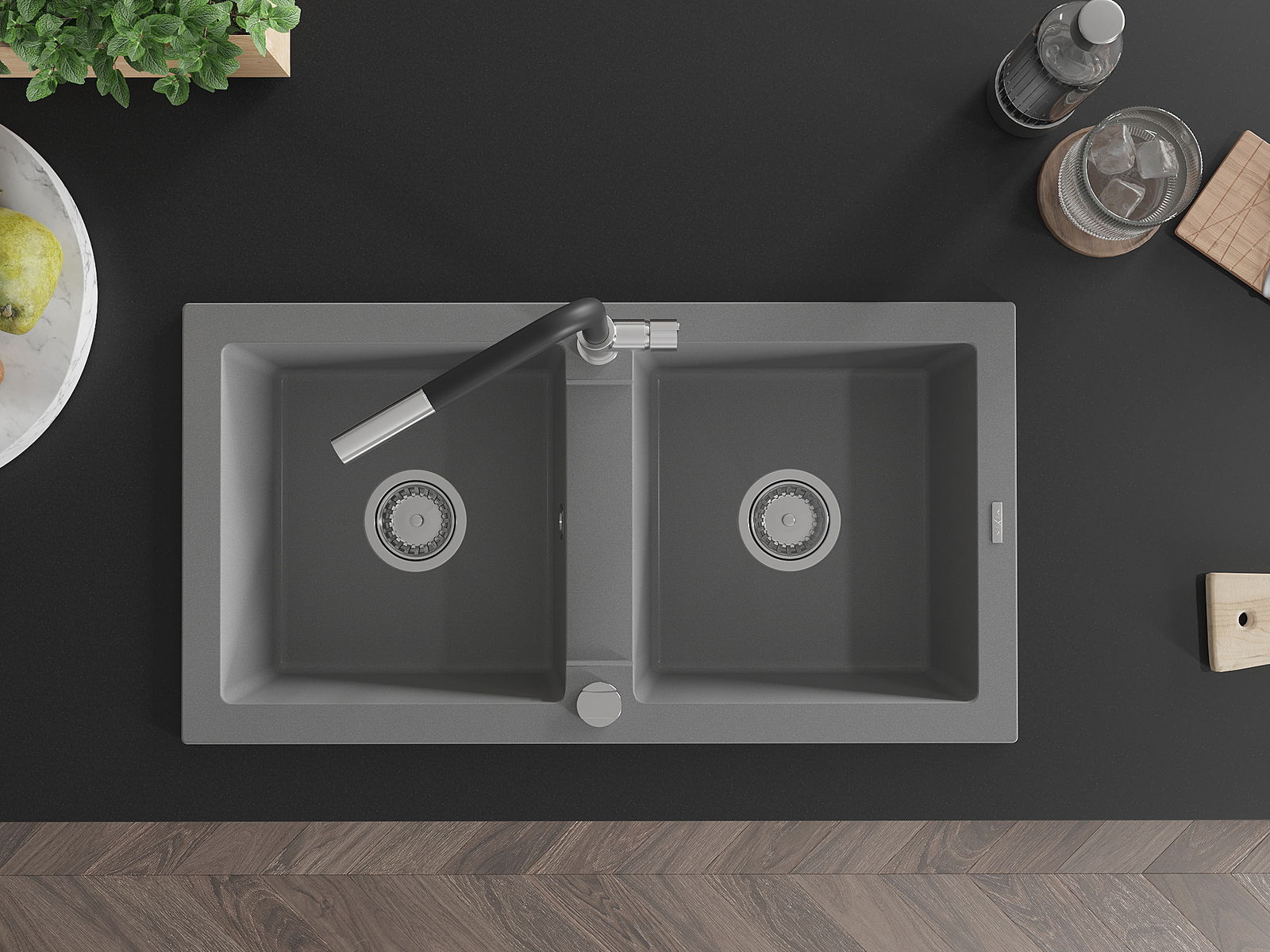 Mexen Mario žulový drez 2-komorový s kuchynskou batériou Flora, sivý - 6504-71-670401-07