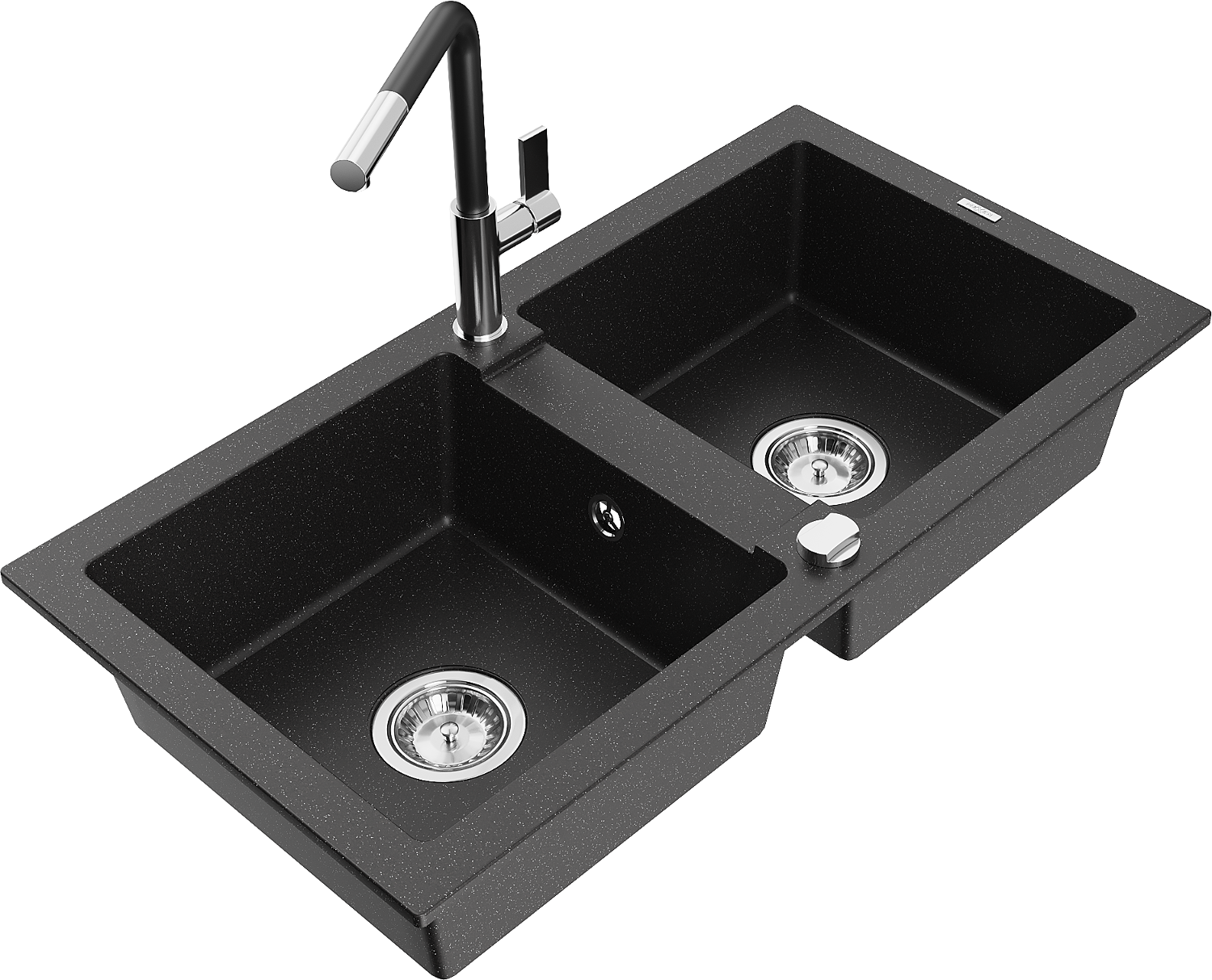 Mexen Mario dvojkomorový granitový drez s kuchynskou batériou Flora, čierny/strieborný metalik - 6504-73-670401-07