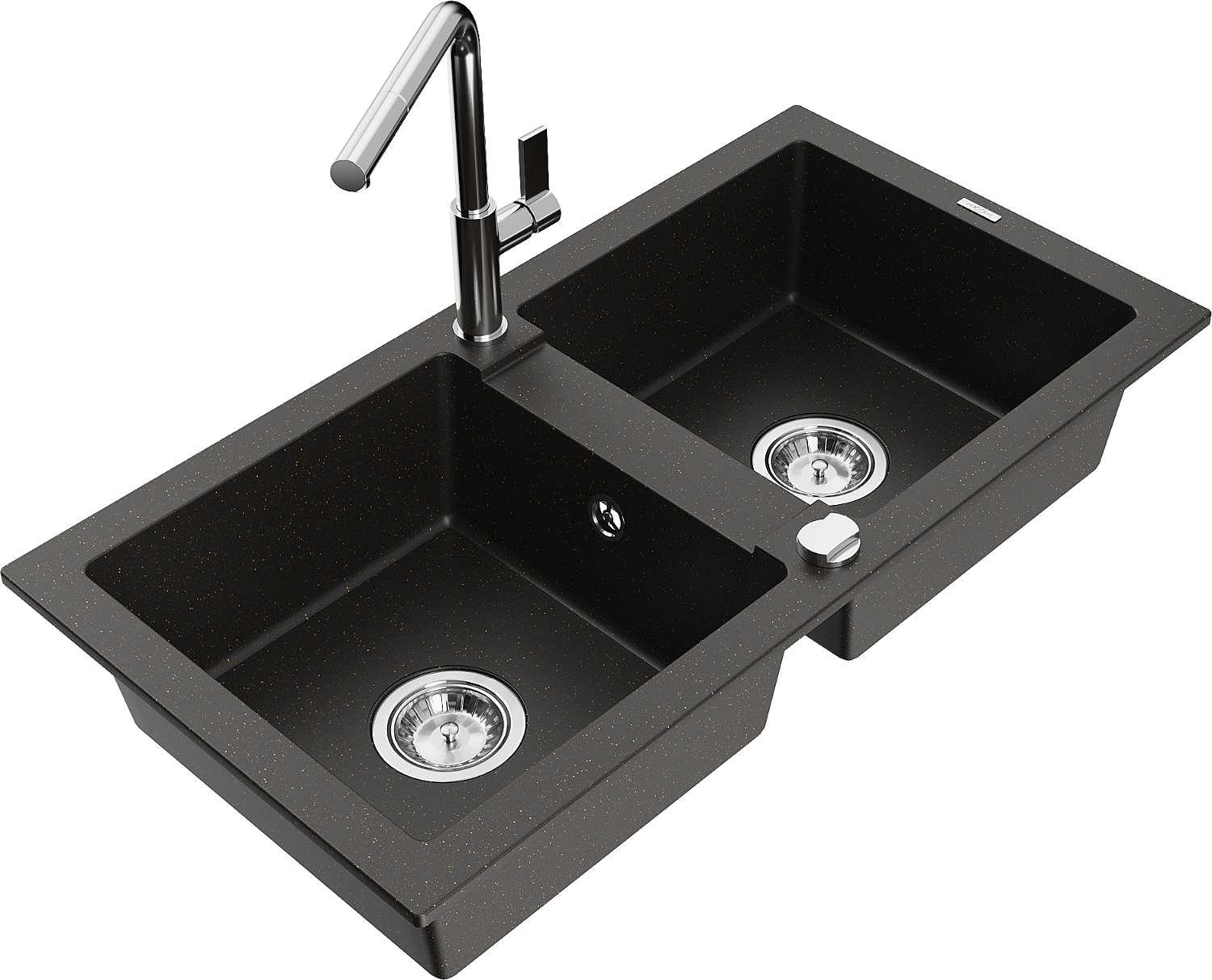 Mexen Mario žulový kuchynský drez 2-komorový s kuchynskou batériou Flora, čierny/zlatý metalik - 6504-75-670401-00
