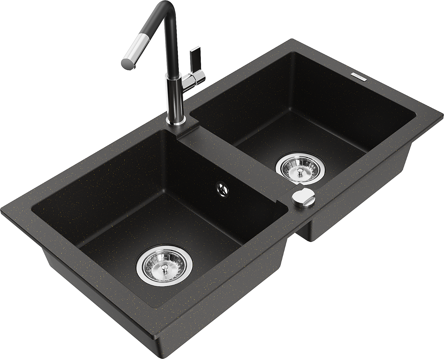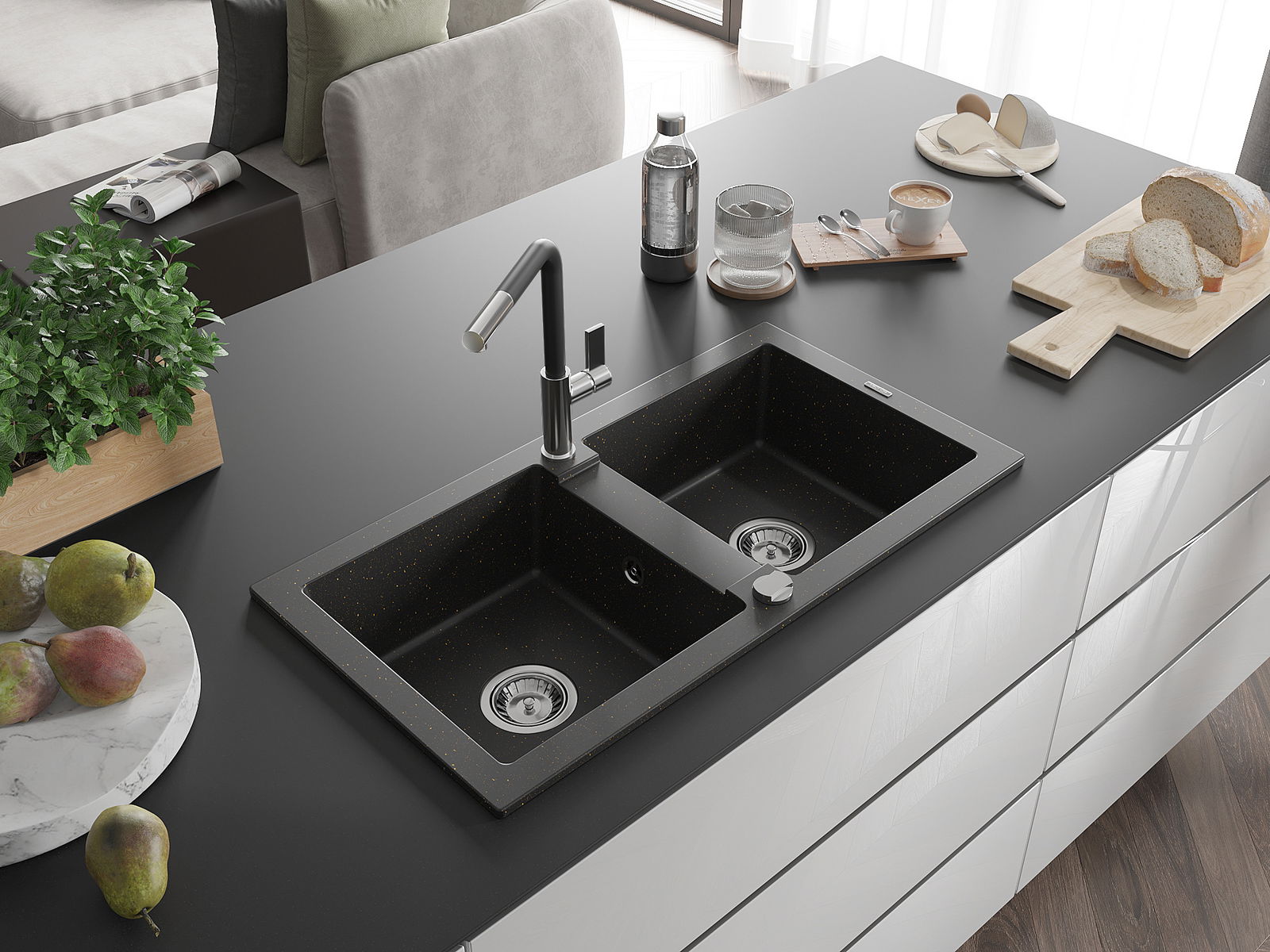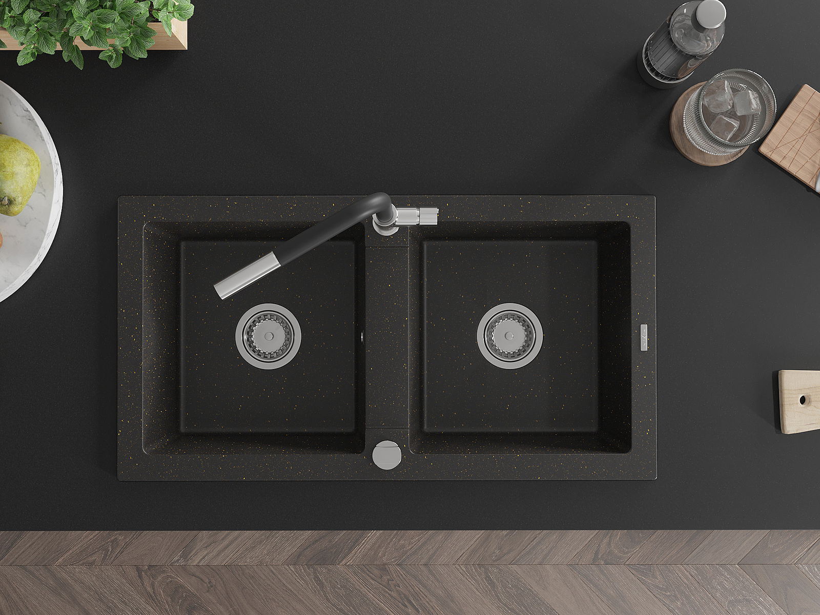 Mexen Mario dvojkomorový kuchynský drez z granitu s kuchynskou batériou Flora, čierny/zlatý metalik - 6504-75-670401-07