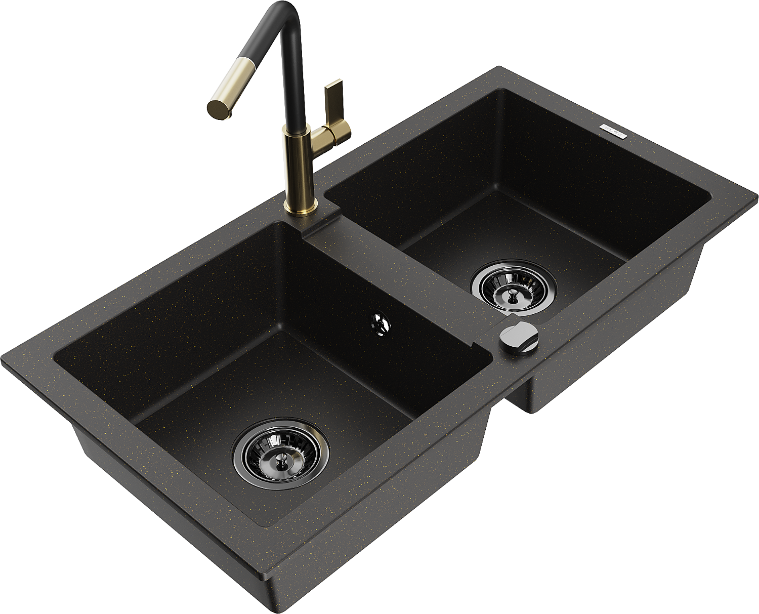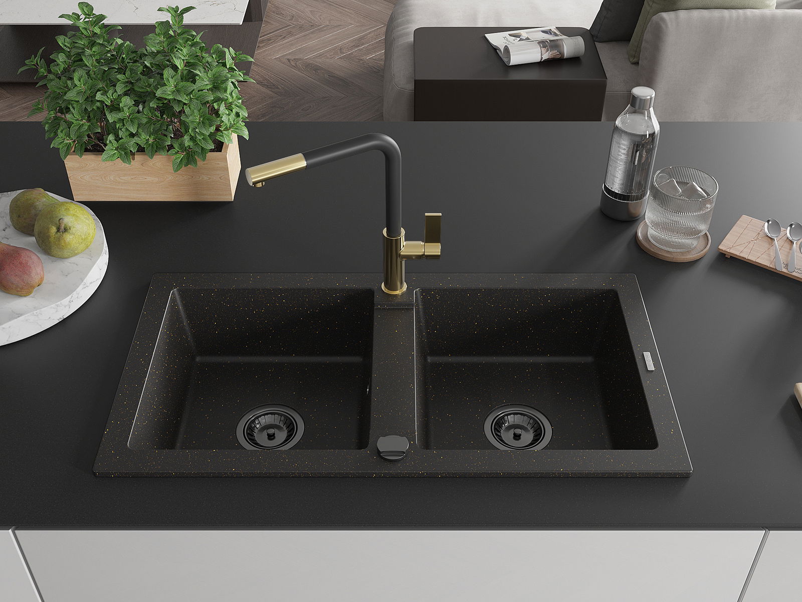 Mexen Mario kamenný drez 2-komorový s kuchynskou batériou Flora, čierny/zlatý metalik - 6504-75-670401-57-B