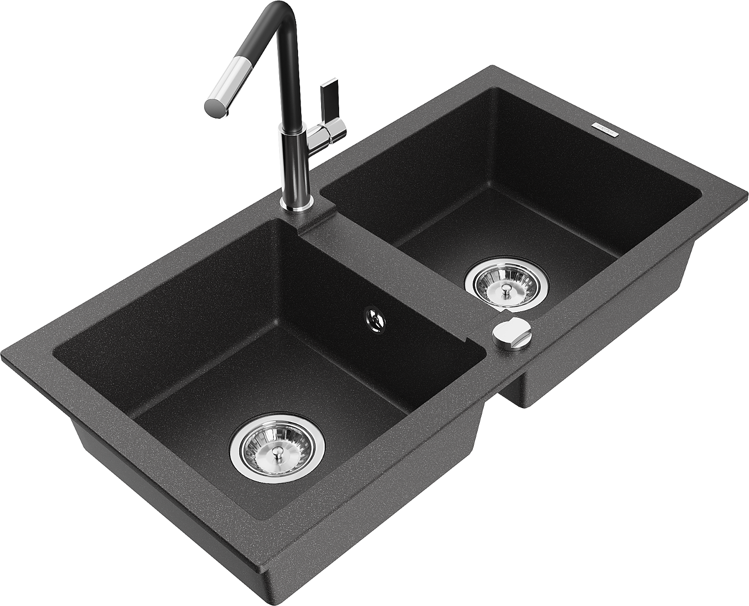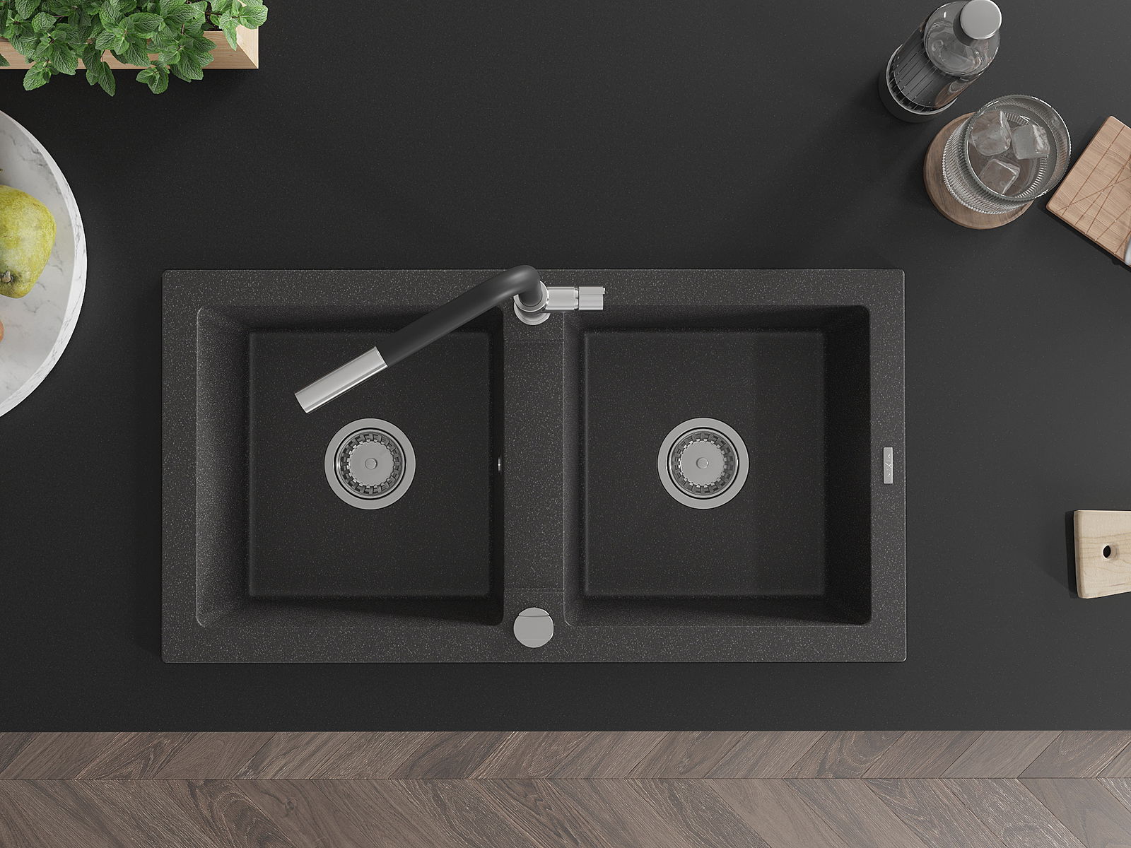 Mexen Mario žulový kuchynský drez s 2 komorami s kuchynskou batériou Flora, čierny bodkovaný - 6504-76-670401-07