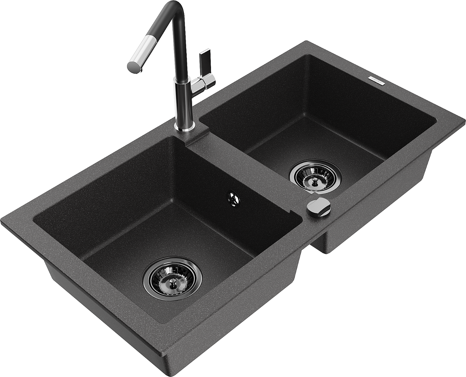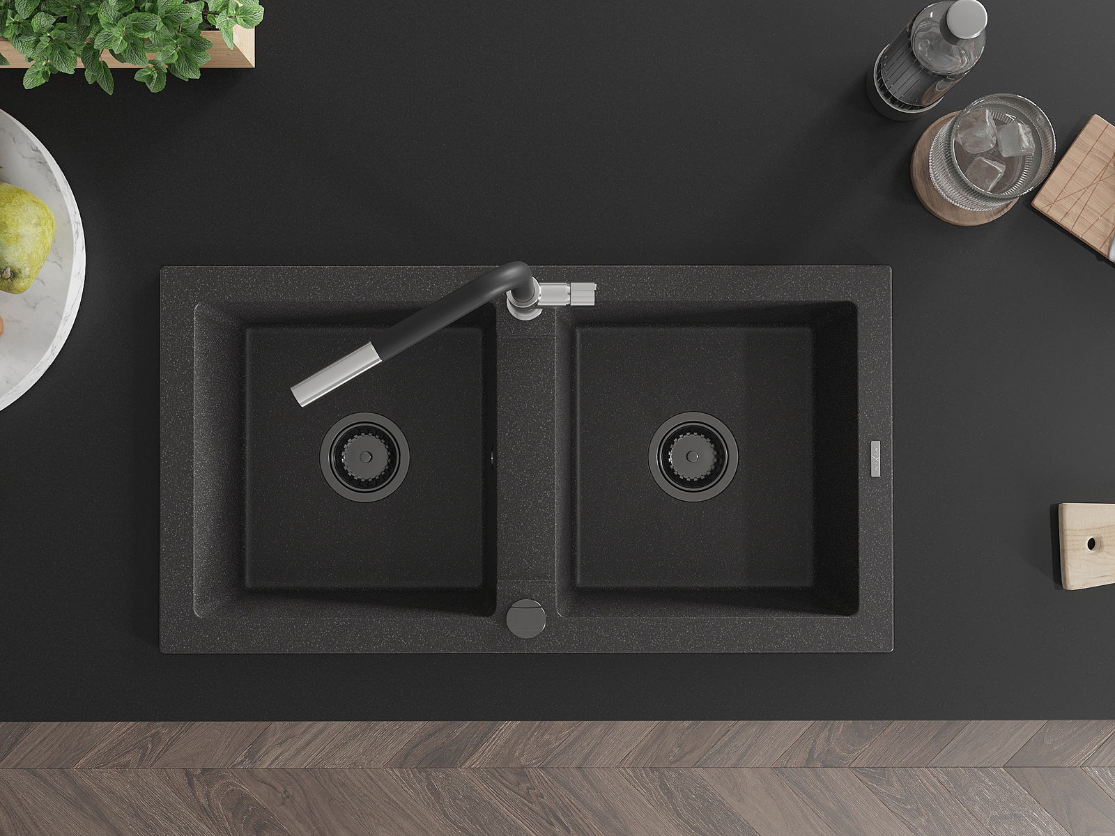 Mexen Mario dvojkomorový granitový drez s kuchynskou batériou Flora, čierny striekaný - 6504-76-670401-07-B