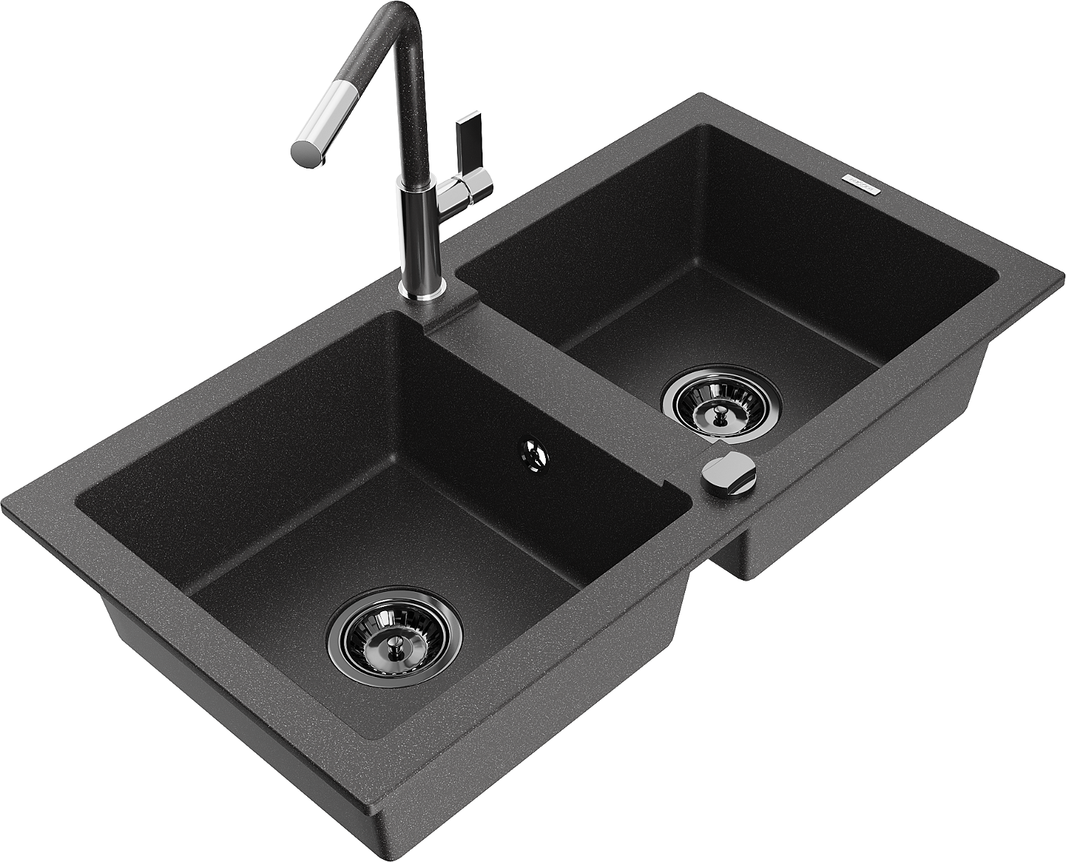 Mexen Mario dvojkomorový žulový drez s kuchynskou batériou Flora, čierny škvrnitý - 6504-76-670401-08-B