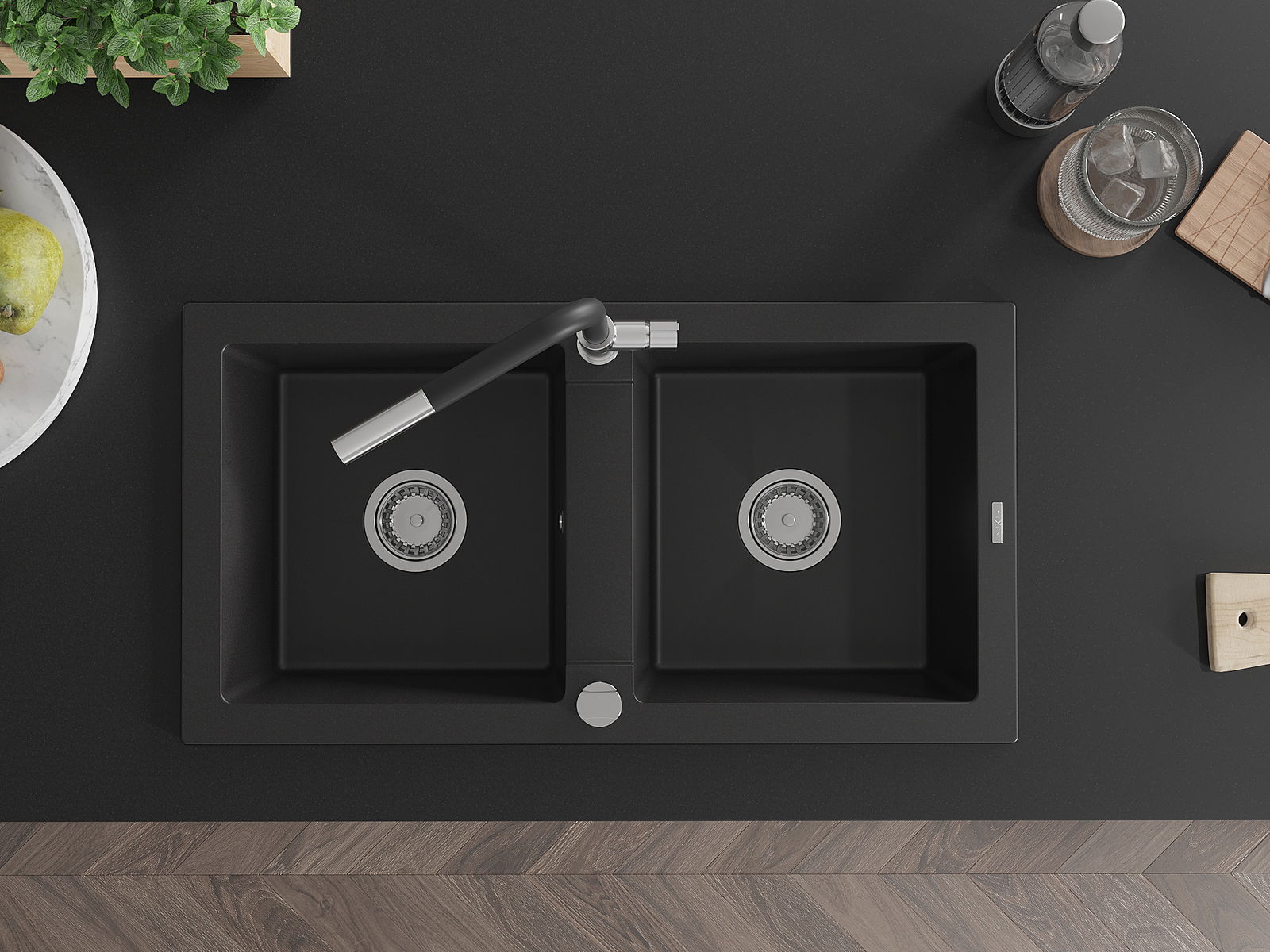 Mexen Mario žulový drez s 2 komorami a kuchynskou batériou Flora, čierny - 6504-77-670401-07