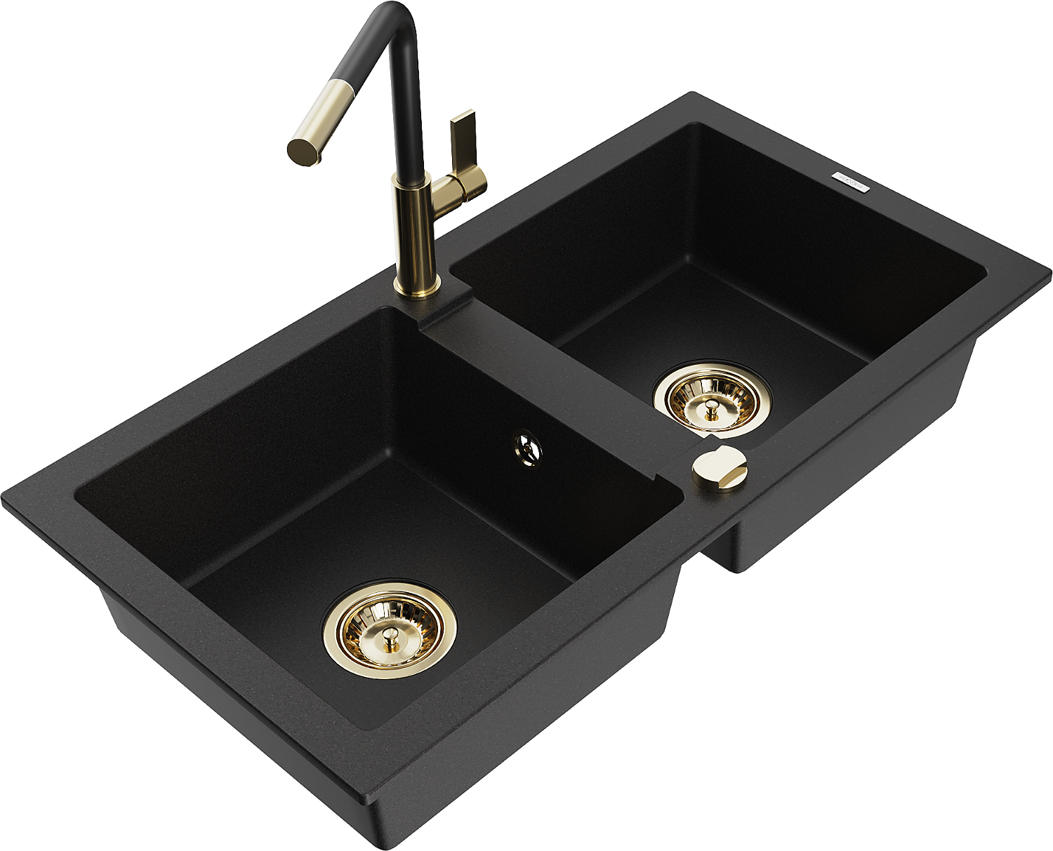 Mexen Mario žulový drez 2-komorový s kuchynskou batériou Flora, čierny - 6504-77-670401-57-G