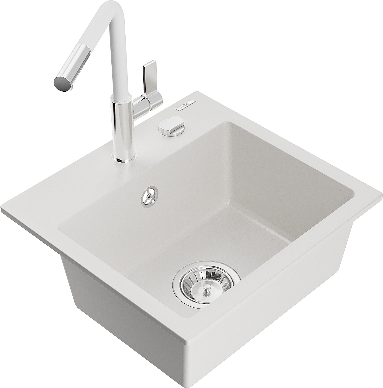 Mexen Milo žulový drez s 1 komorou s kuchynskou batériou Flora, biely - 6505-20-670401-02