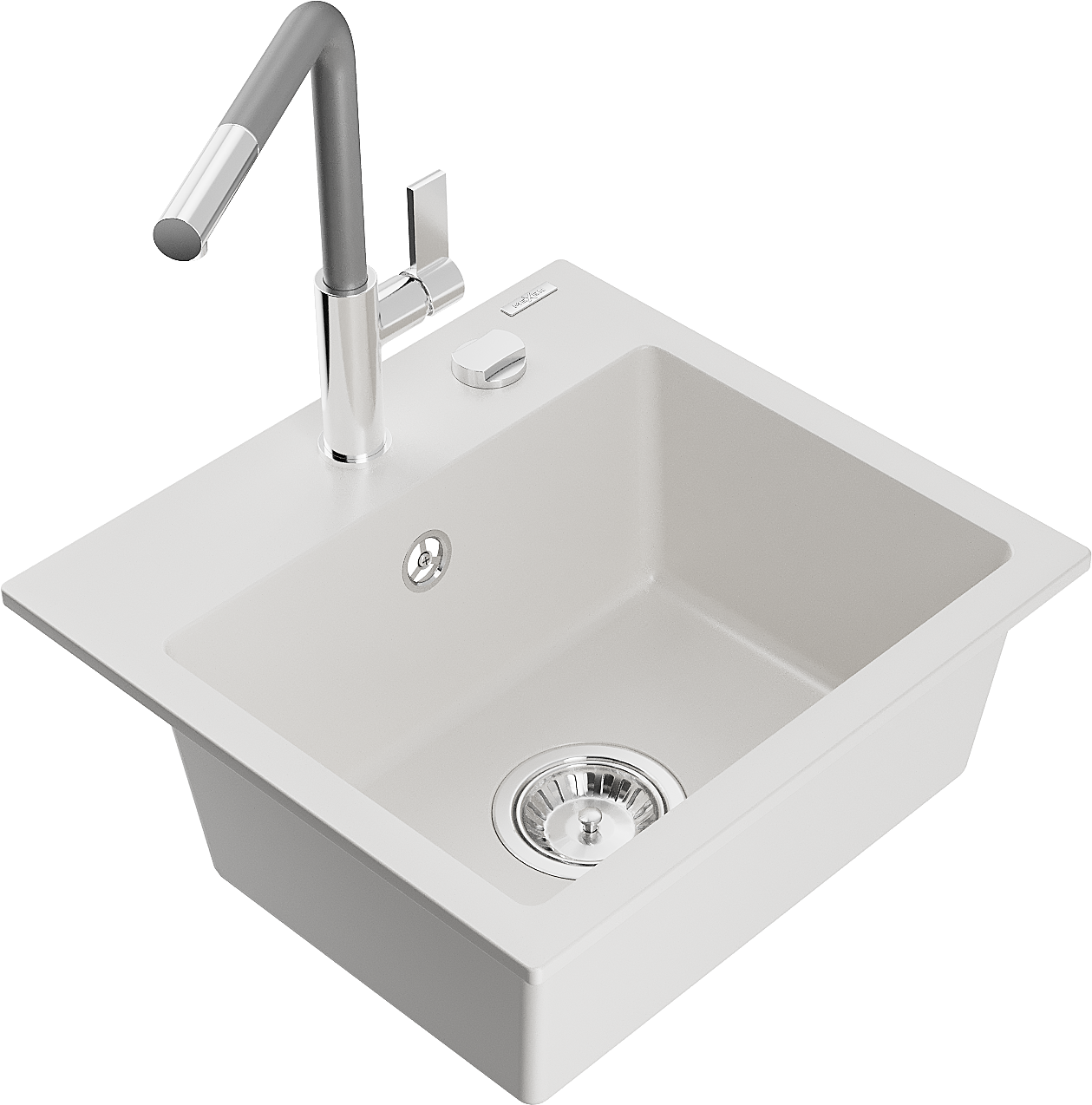 Mexen Milo granitový drez 1-komorový s kuchynskou batériou Flora, biely - 6505-20-670401-06