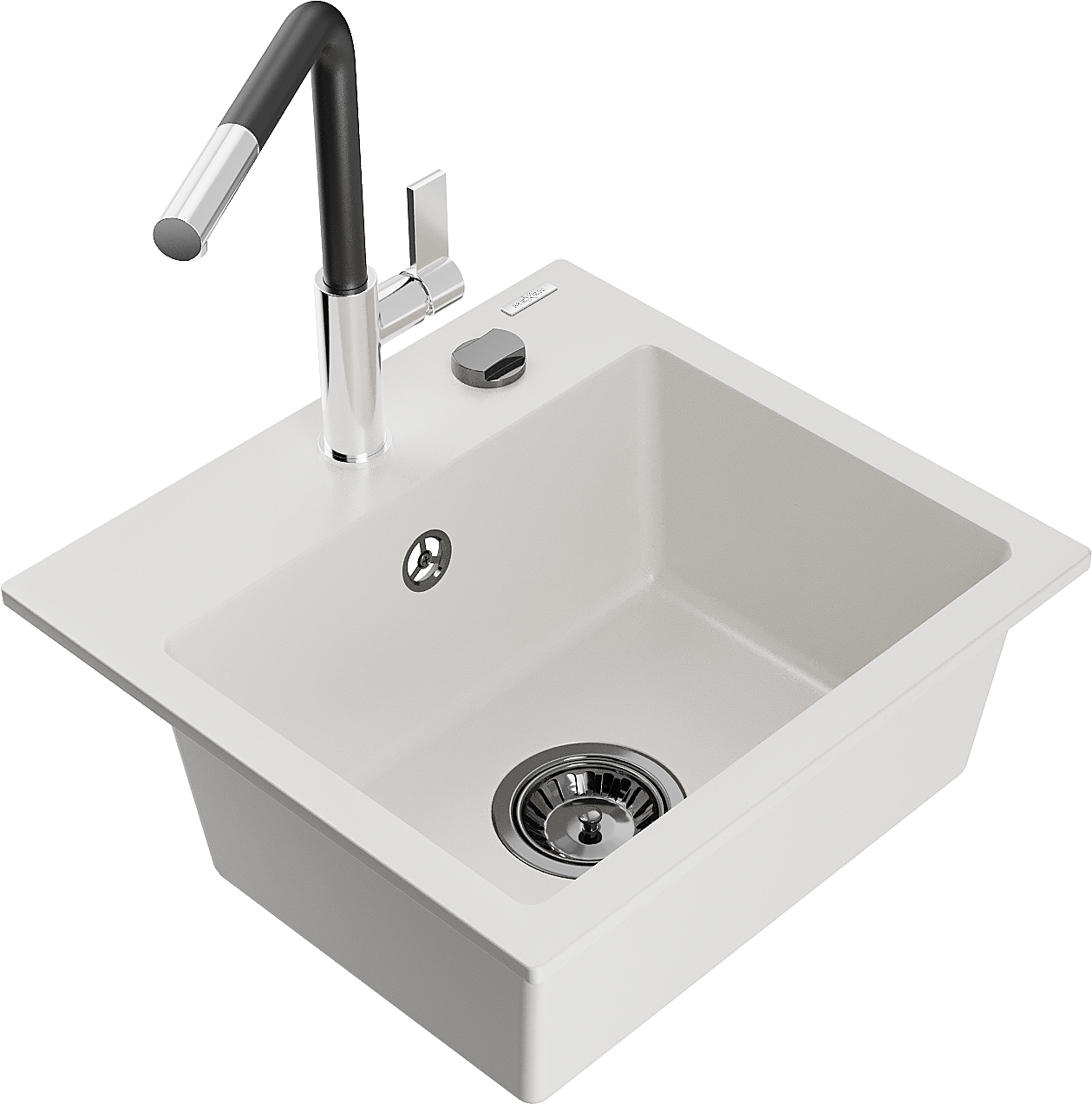 Mexen Milo žulový kuchynský drez s 1-komorou a kuchynskou batériou Flora, biely - 6505-20-670401-07-B