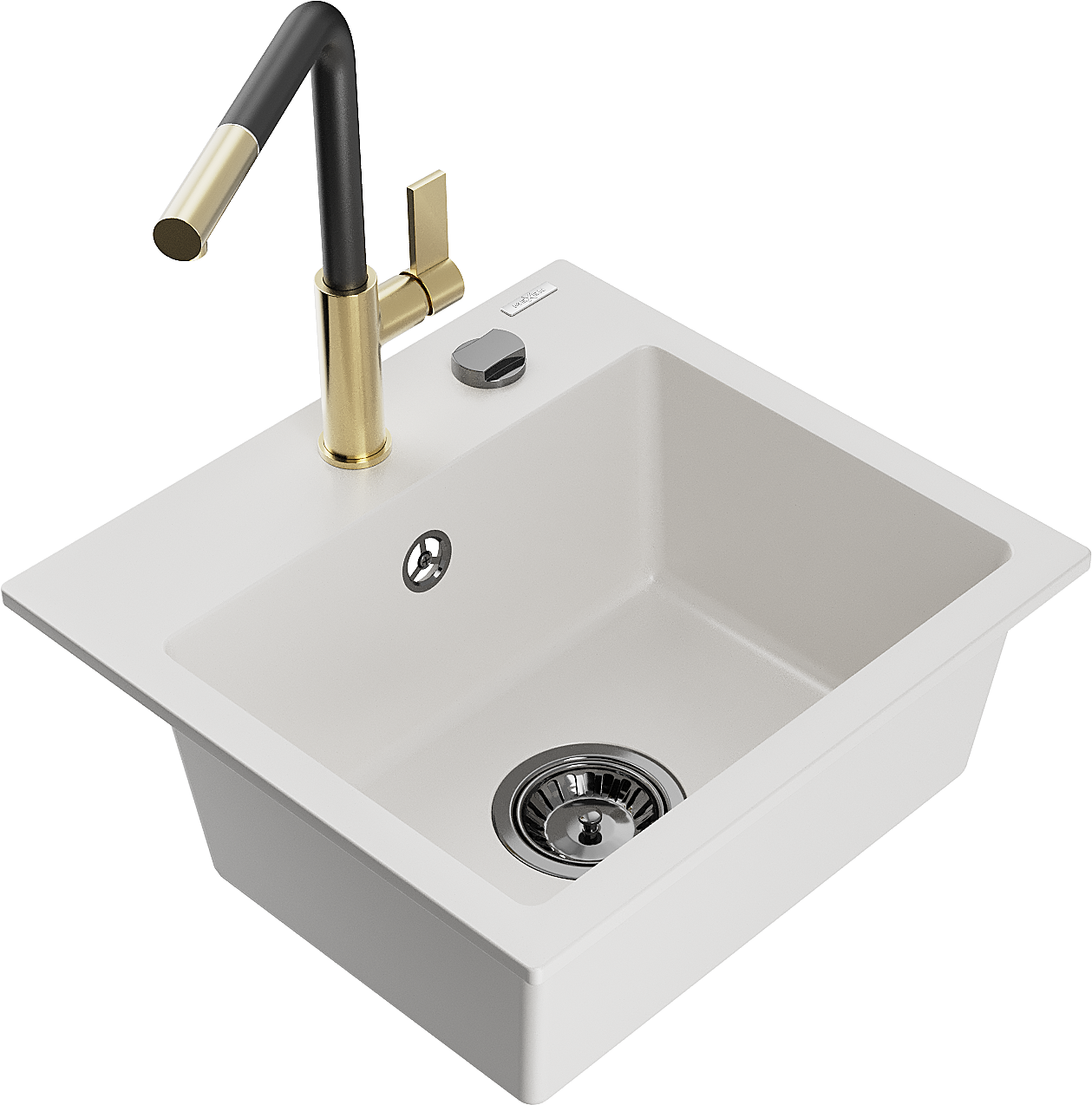 Mexen Milo žulový kuchynský drez s 1 komorou a kuchynskou batériou Flora, biely - 6505-20-670401-57-B