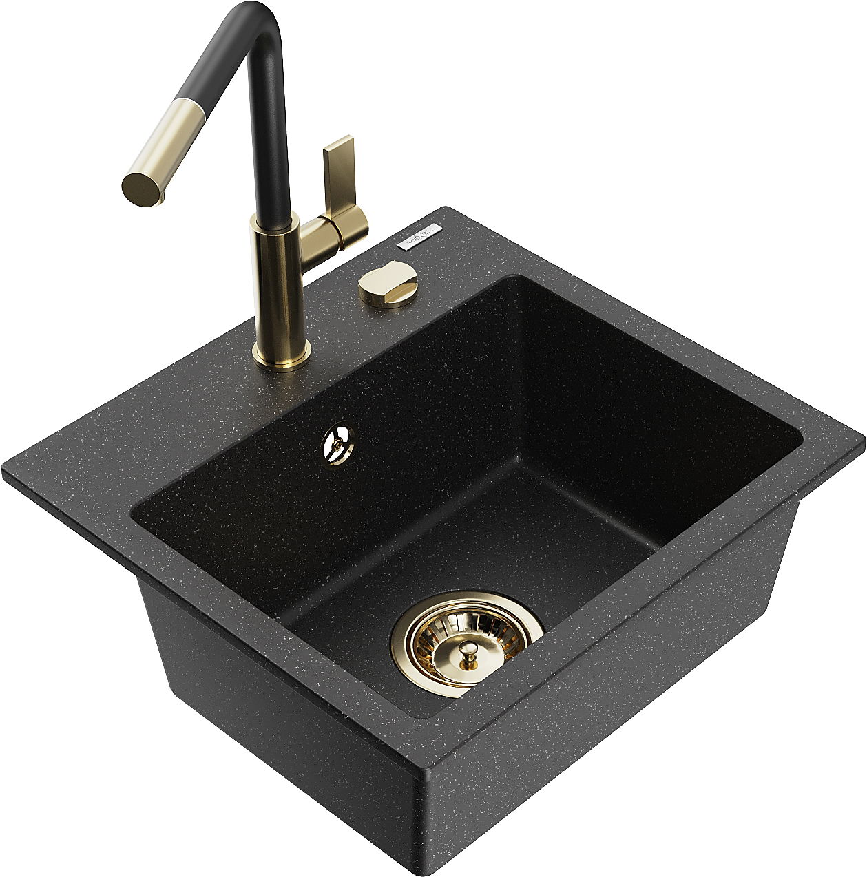 Mexen Milo granitový drez 1-komorový s kuchynskou batériou Flora, čierny/strieborný metalik - 6505-73-670401-57-G
